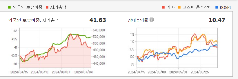 단기 포트폴리오를 구성할 때는 시가 총액과 장중 거래량도 중요합니다. 기아의 시가 총액은 48조5028억 원이며 장중 거래량은 863,955원 을 기록했습니다. 대주주의 정보는 크게 중요하지 않지만 장기적으로는 확인하는 것이 좋겠습니다.