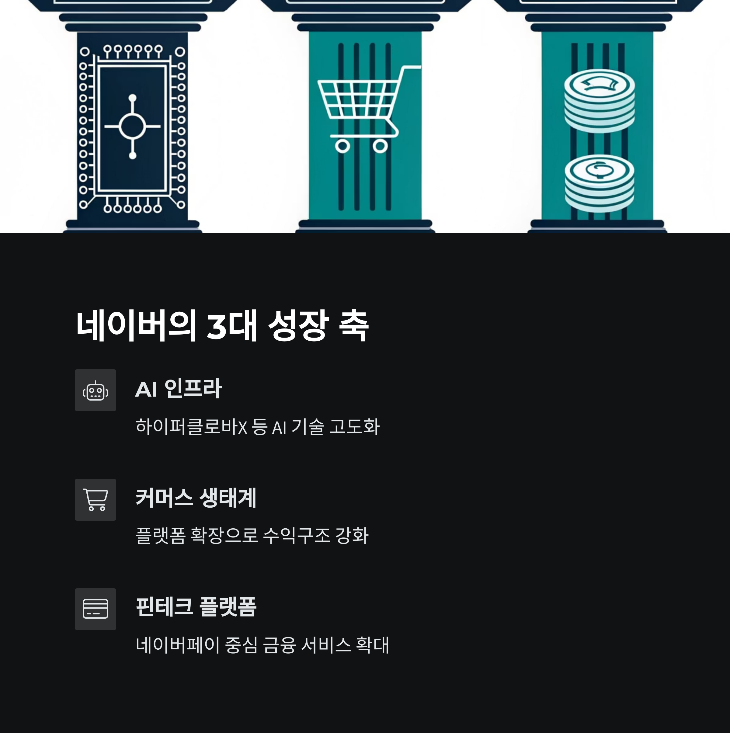 네이버의 성장은 단순한 콘텐츠 플랫폼을 넘어 AI, 커머스, 핀테크라는 3대 사업 축을 중심으로 뚜렷한 전략적 행보를 보이고 있습니다. 특히 하이퍼클로바X와 같은 AI 인프라의 고도화, 커머스 생태계 확장, 네이버페이 중심의 금융 플랫폼 강화는 중장기적 수익 구조를 견고히 만드는 핵심 요소입니다.