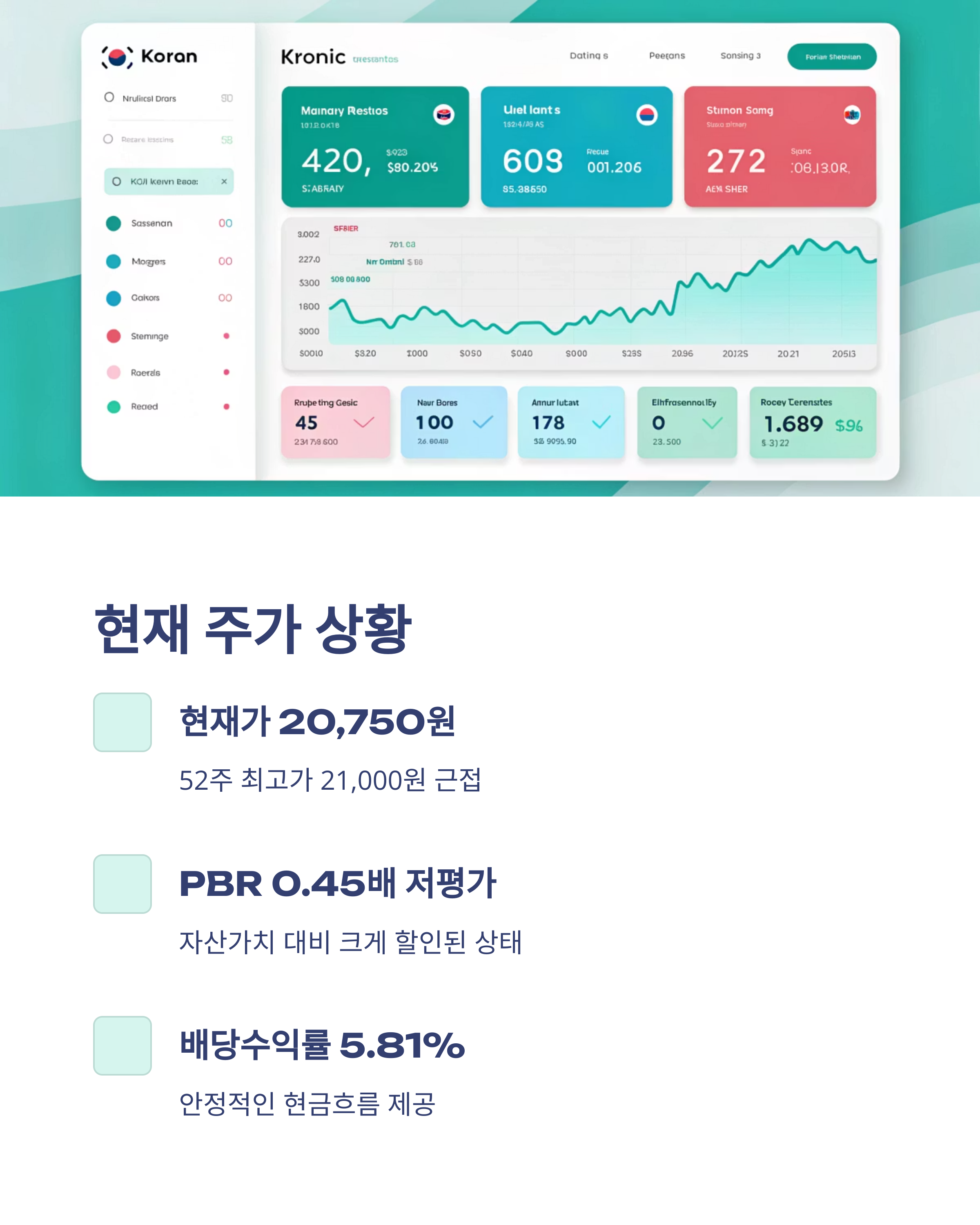 대신증권은 2025년 종합금융투자사업자 지정을 앞두고 성장 모멘텀과 안정적 배당 매력을 동시에 갖춘 종목입니다. PBR 0.45배의 저평가 구간에서 밸류에이션 회복과 실적 반등이 기대되며, 증권업 전반의 개선 흐름과 함께 중장기 투자 유망 종목으로 주목받고 있습니다.