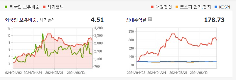 단기 포트폴리오를 구성할 때는 시가 총액과 장중 거래량을 살펴봐야 합니다. 대원전선의 시가 총액은 3194억 원이며 장중 거래량은 18,976,040원 을 기록했습니다. 대주주의 정보는 크게 중요하지 않을 수도 있지만 장기적인 관점에서는 확인하는 것이 좋겠습니다.