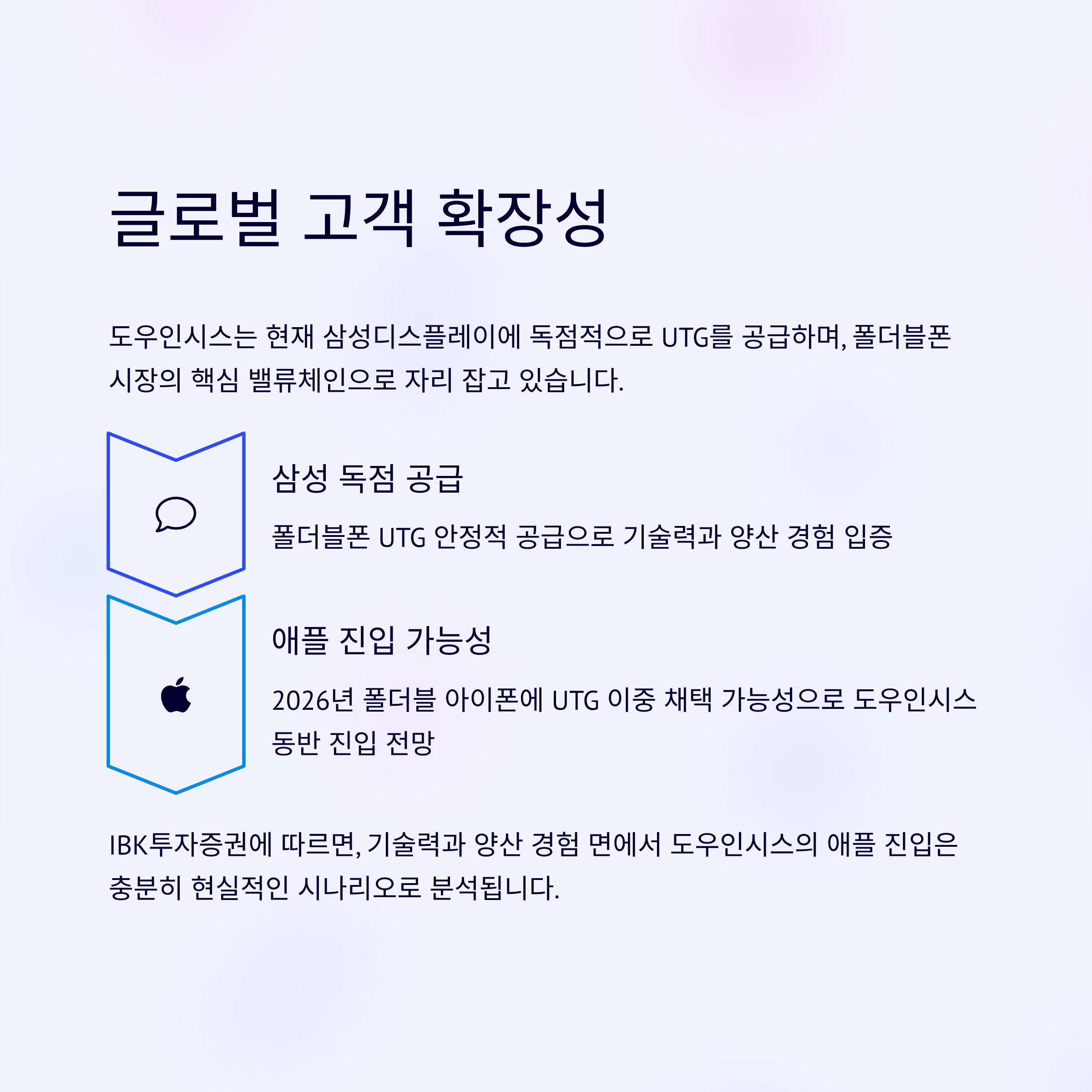 도우인시스는 초박형 강화유리(UTG) 분야에서 독보적인 경쟁력을 갖춘 기업으로, 삼성디스플레이에 UTG를 독점 공급하고 있습니다. 여기에 애플 폴더블 아이폰의 핵심 공급사로 부각되면서 2026년부터 본격적인 실적 레벨업이 기대되고 있습니다. 단기적으로는 밸류에이션 부담과 계절성 이슈가 있지만, 중장기적으로는 확실한 기술력과 시장 확장으로 주가 상승 여력은 충분해 보입니다.