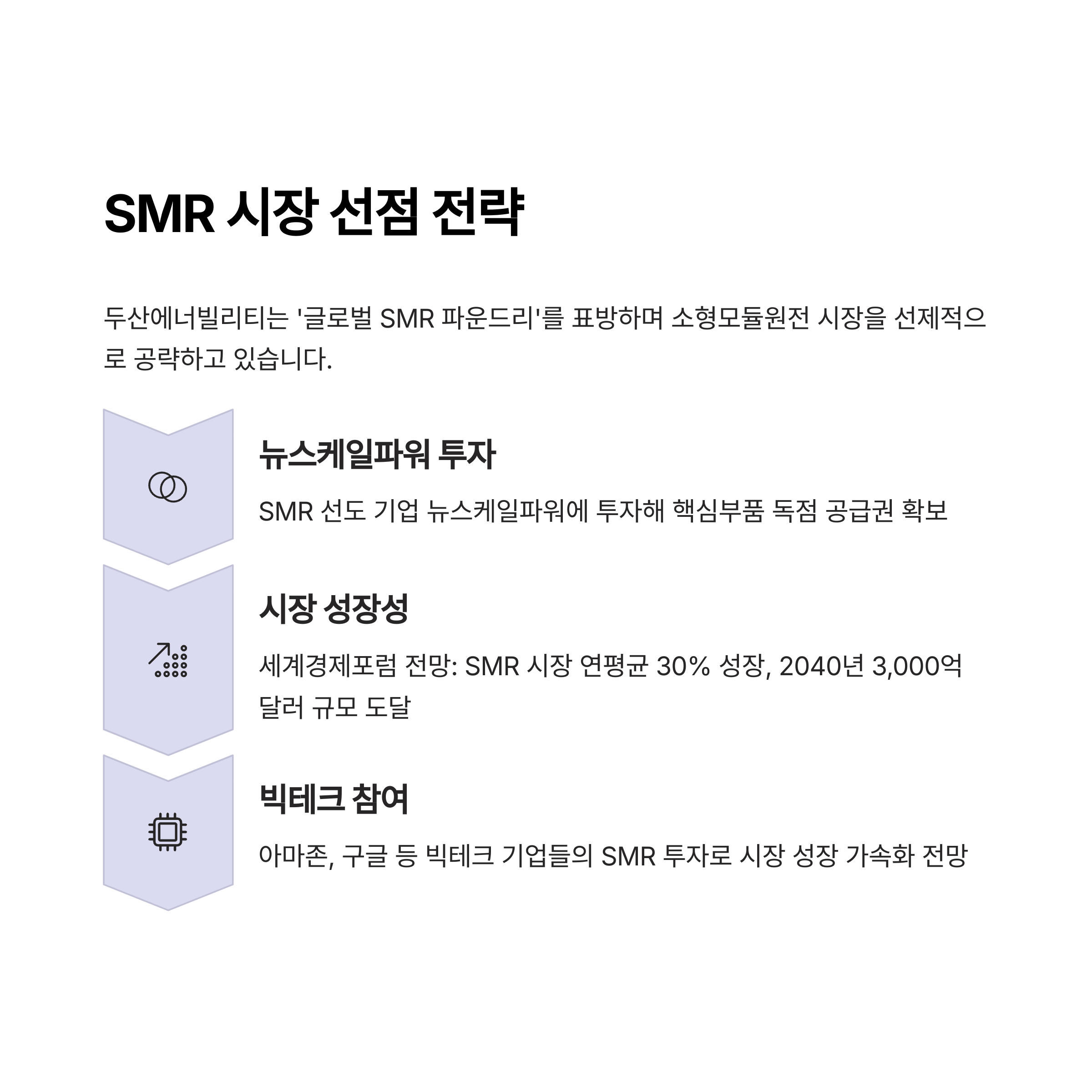 두산에너빌리티는 SMR 시장에서 '글로벌 SMR 파운드리'를 표방하며, 뉴스케일파워에