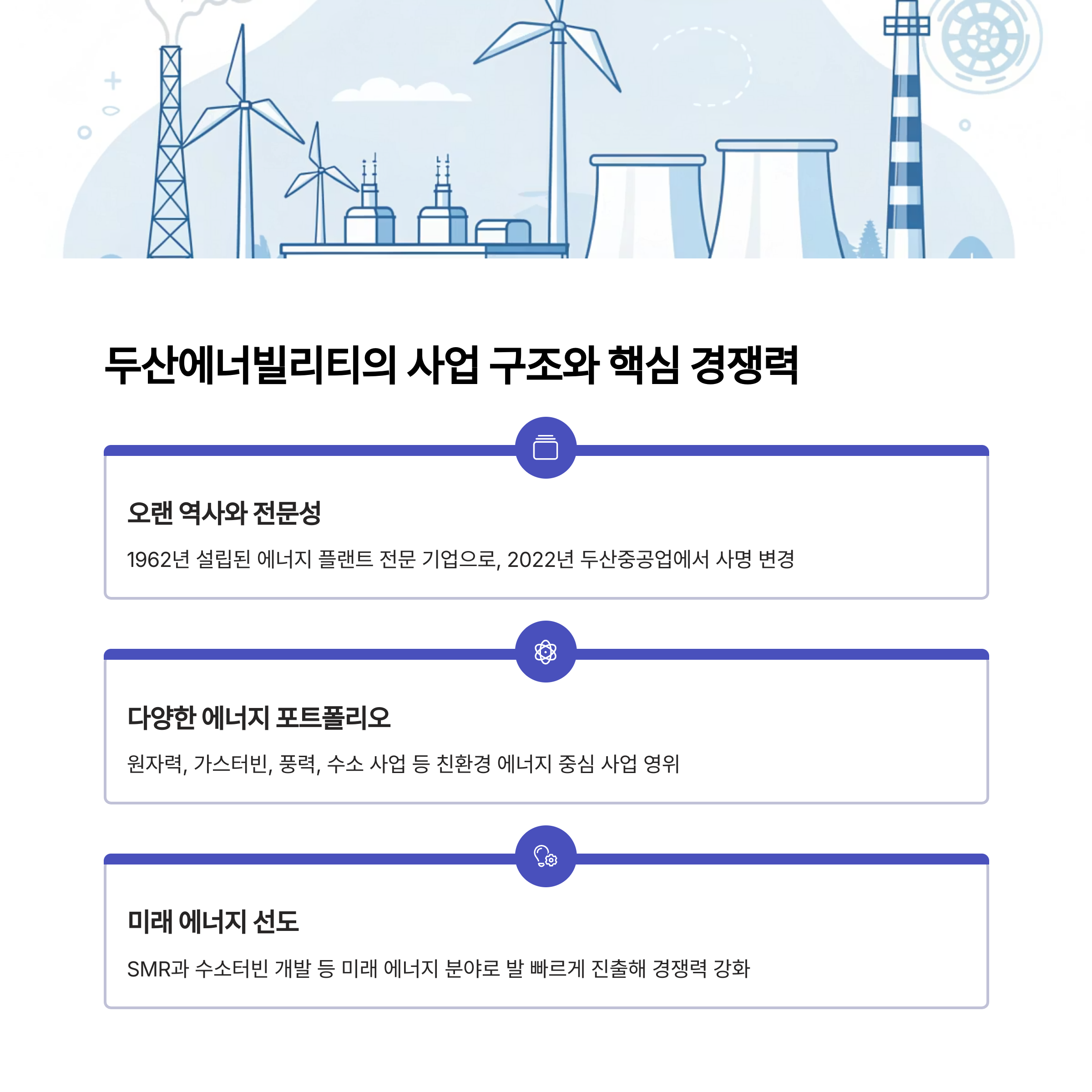 두산에너빌리티는 1962년 설립되어 오랜 역사를 자랑하는 에너지 플랜트 전문 기업입니다.