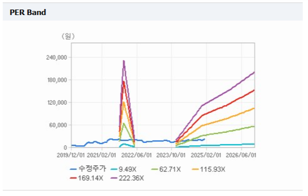 - PER(주가수익비율) 222.36배로 업종 평균 대비 고평가 우려