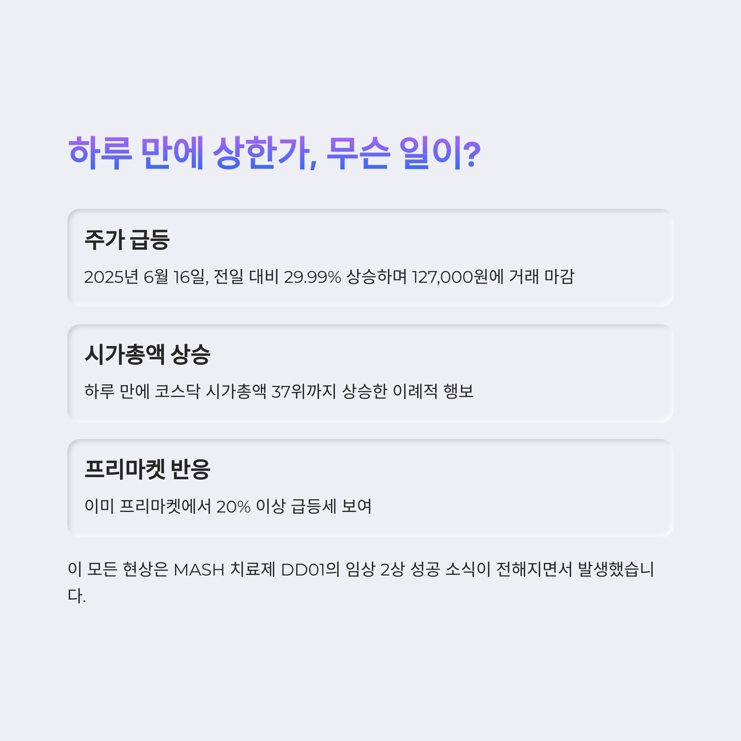 2025년 6월 16일, 디앤디파마텍 주가는 전일 대비 29.99% 상승하며 127,000원에 거래를 마쳤습니다. 이는 MASH 치료제 DD01의 임상 2상 성공 소식이 전해지면서 발생한 급등입니다.