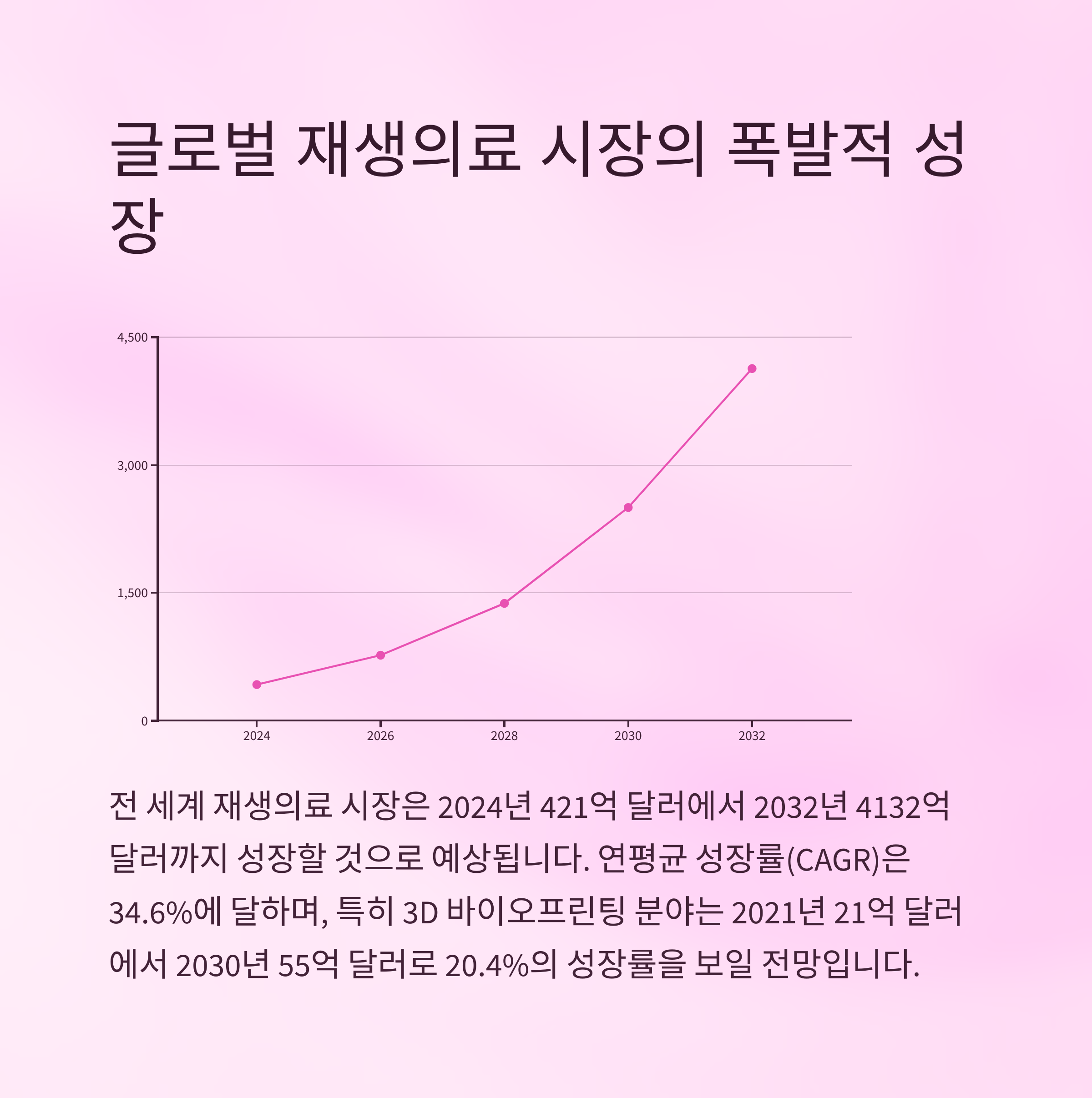 전 세계 재생의료 시장은 2024년 421억 달러에서 2032년 4132억 달러까지 성장할 것으로 보입니다.