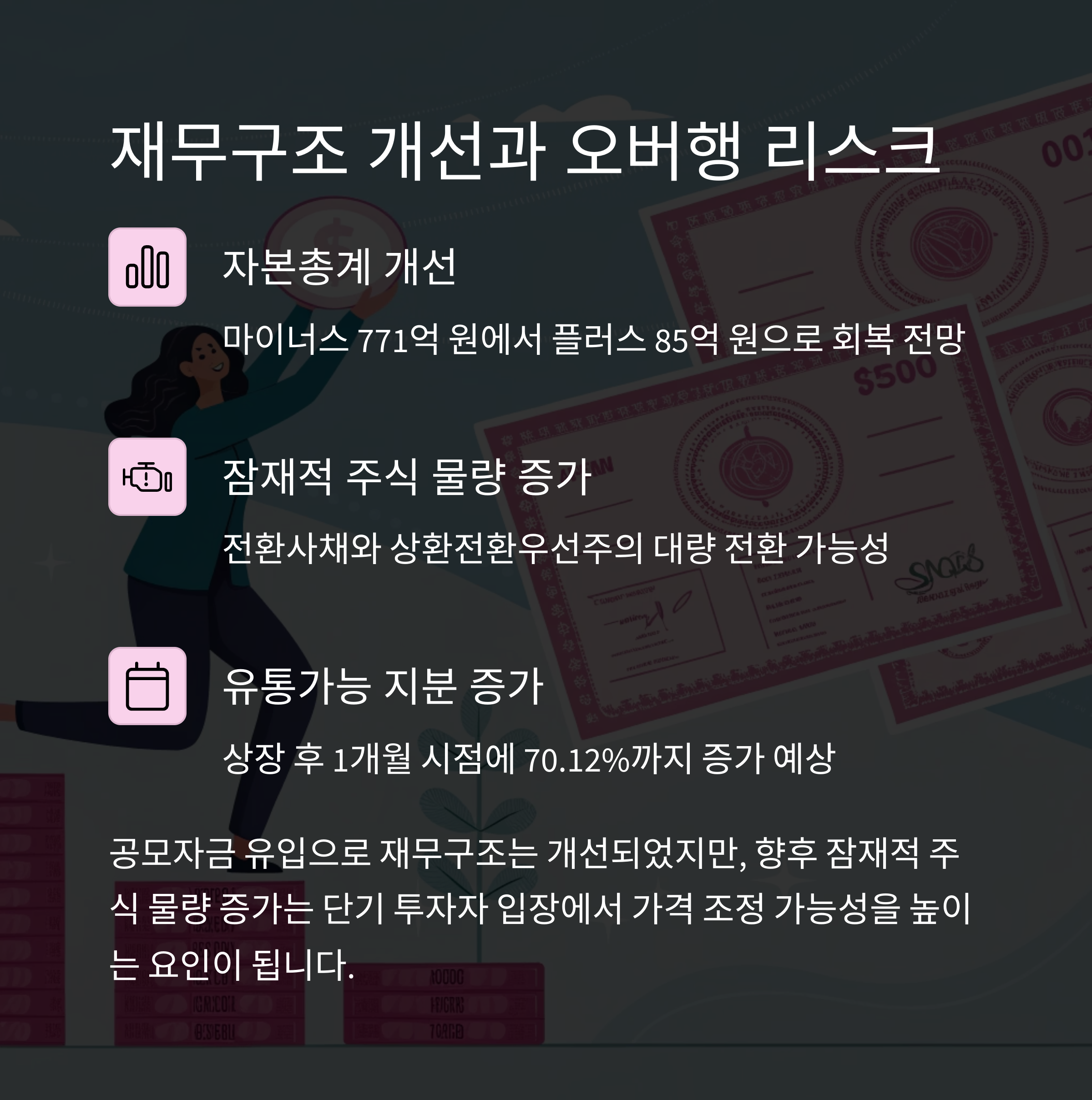 그러나 단기적인 주가 급등에는 수급 이슈와 오버행 리스크가 잠재되어 있어 신중한 접근이 필요합니다.
