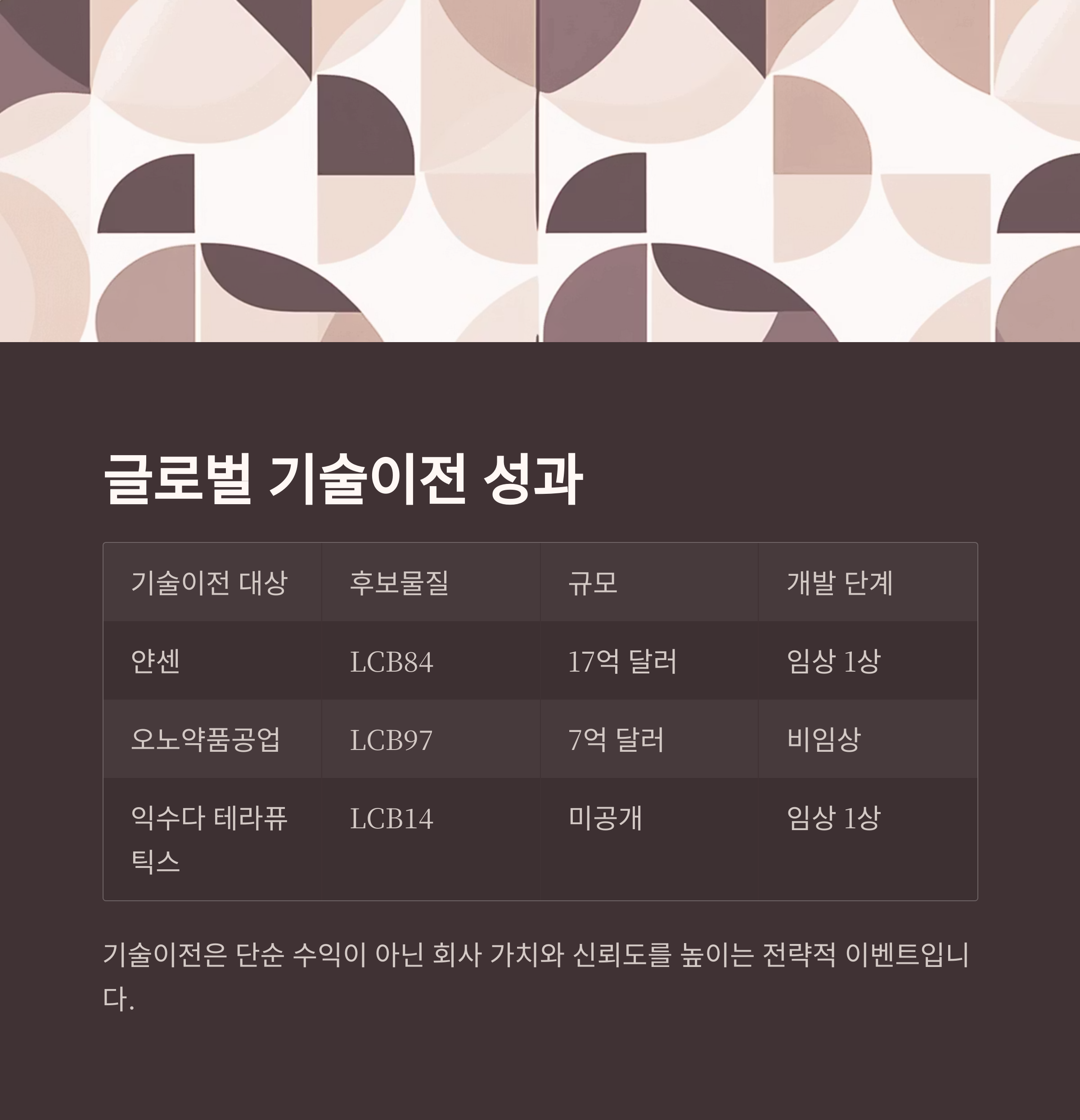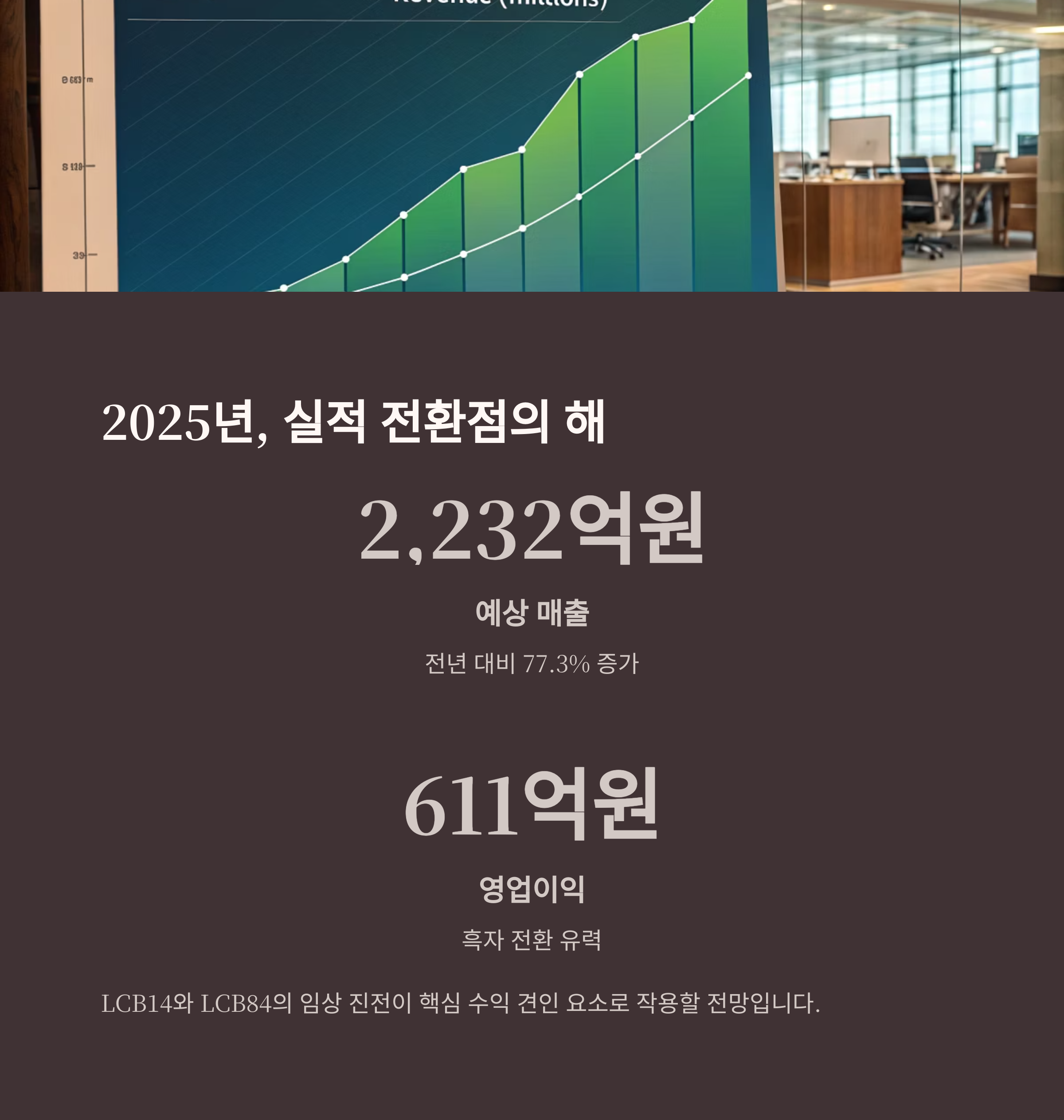 특히, LCB14와 LCB84의 임상 진전이 핵심 수익 견인 요소로 작용할 전망입니다.