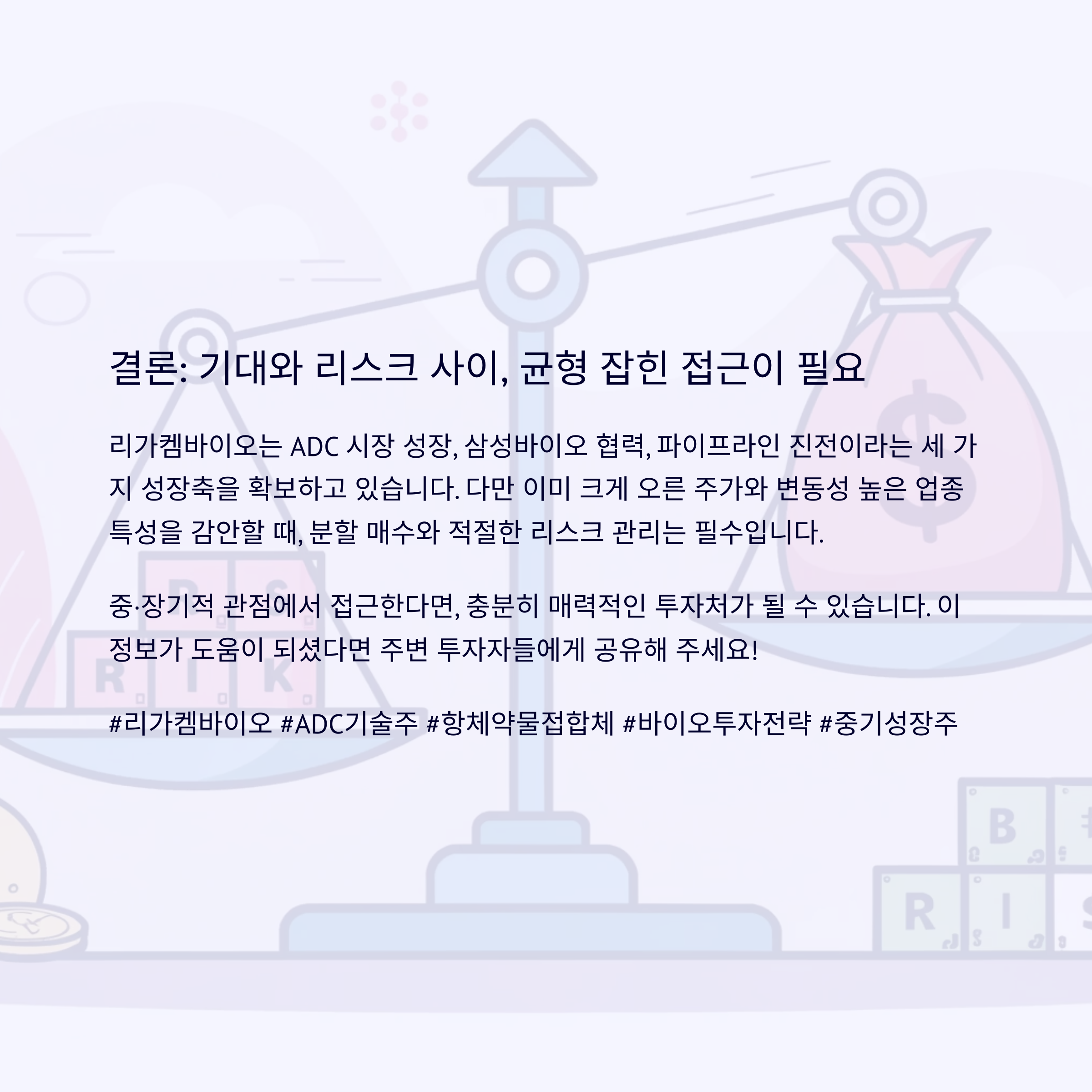 리가켐바이오는 ADC 시장 성장, 삼성바이오 협력, 파이프라인 진전이라는 세 가지 성장축을 확보하고 있습니다. 다만 이미 크게 오른 주가와 변동성 높은 업종 특성을 감안할 때, 분할 매수와 적절한 리스크 관리는 필수입니다. 중·장기적 관점에서 접근한다면, 충분히 매력적인 투자처가 될 수 있습니다.