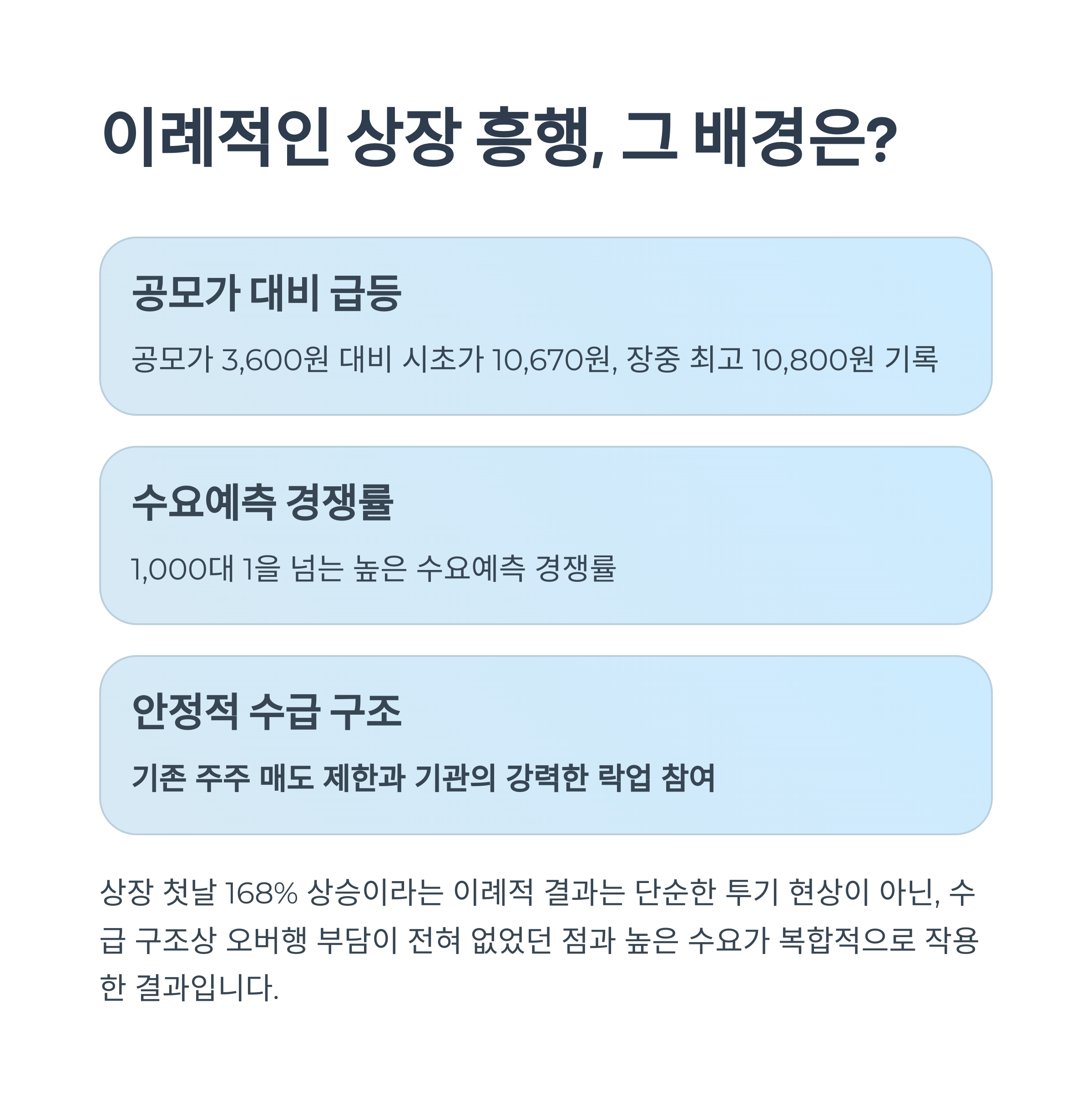 상장 첫날 168% 상승이라는 이례적 결과는 단순한 투기 현상이 아닙니다. 공모가 3,600원 대비 시초가 10,670원, 장중 최고 10,800원 기록은 수급 구조상 오버행 부담이 전혀 없었던 점과, 1,000대 1을 넘는 수요예측 경쟁률이 복합적으로 작용한 결과입니다.