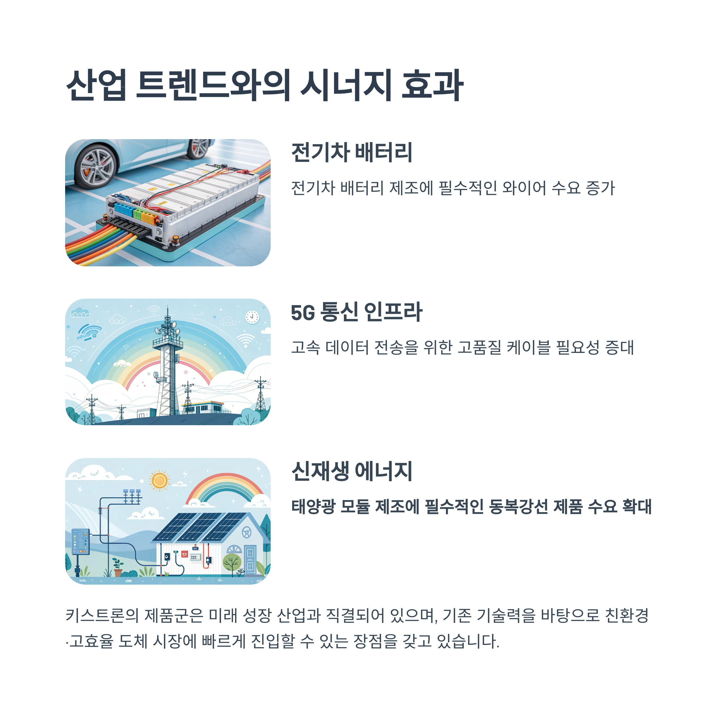 전기차, 5G, 신재생에너지 등과의 연결성은 키스트론 제품의 중장기 수요 확대를 뒷받침합니다. 탄소중립 시대의 수혜주로 자리잡을 가능성이 높습니다.