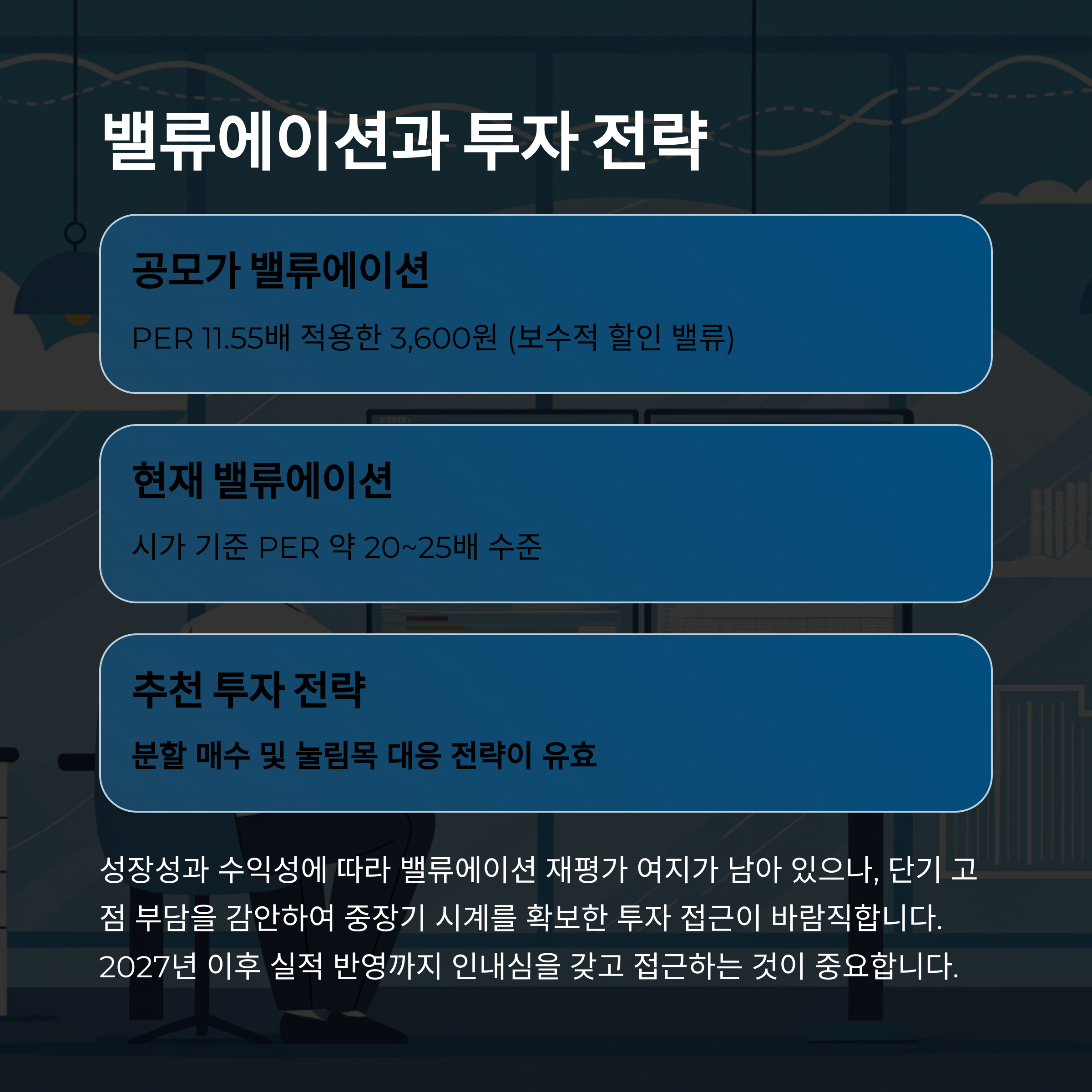 공모가는 PER 11.55배를 적용한 3,600원으로, 현재 주가 대비 여전히 저평가 여지가 있습니다. 분할 매수와 눌림목 매수 전략이 유효하며, 2027년 이후 실적 모멘텀 반영에 주목해야 합니다.