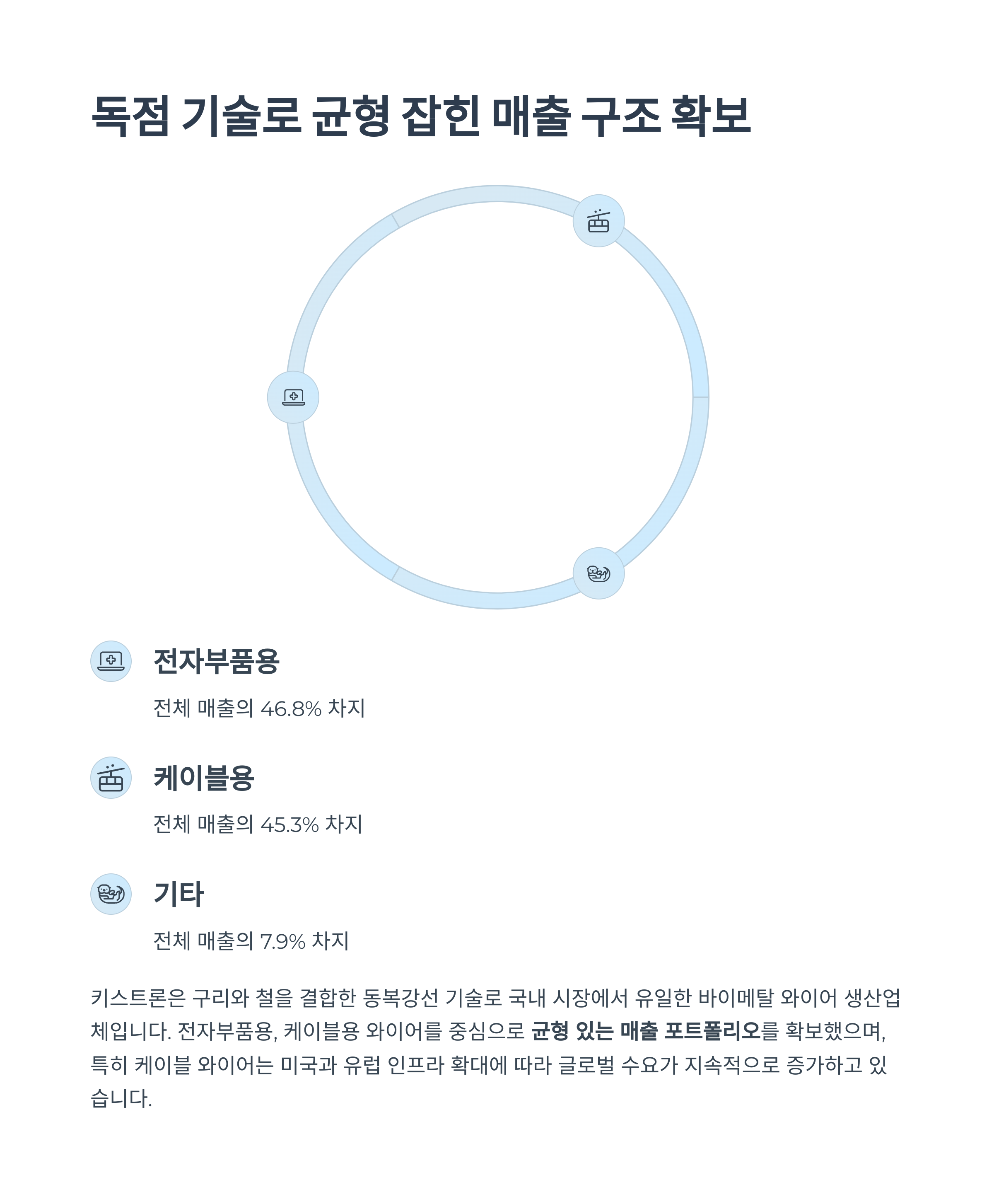 키스트론은 구리와 철을 결합한 동복강선 기술로 국내 시장에서 유일한 바이메탈 와이어 생산업체입니다. 전자부품용, 케이블용 와이어를 중심으로 두 개 사업 영역에서 고르게 매출을 내며, 2024년 기준 매출 비중은 전자부품용 46.8%, 케이블용 45.3%로 균형 있는 포트폴리오를 확보했습니다.