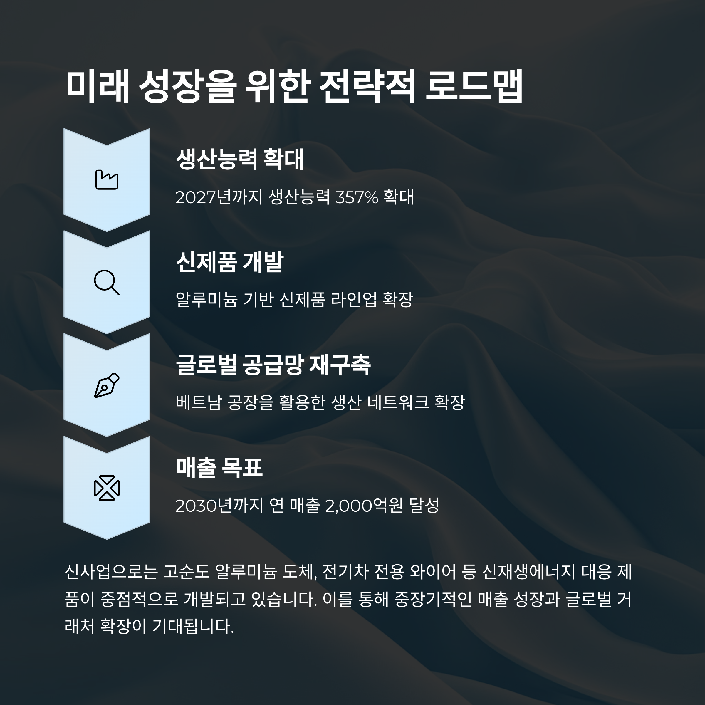 2027년까지 생산능력을 357% 확대하고, 알루미늄 기반 신제품 개발을 통해 연 매출 2,000억원 달성을 목표로 하고 있습니다. 베트남 공장을 활용한 글로벌 공급망 확대 전략도 함께 추진되고 있습니다.