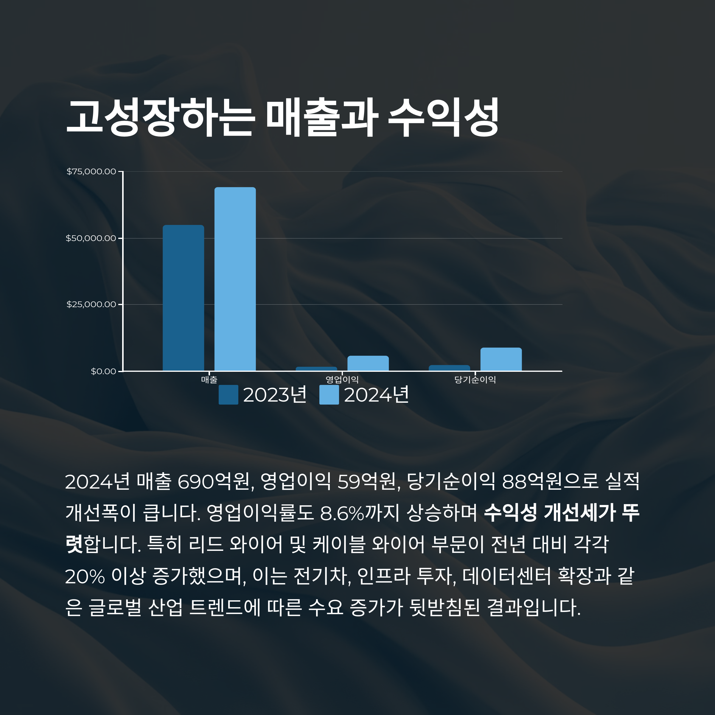2024년 매출 690억원, 영업이익 59억원, 당기순이익 88억원으로 실적 개선폭이 큽니다. 영업이익률도 8.6%까지 상승하며 수익성 개선세가 뚜렷합니다.