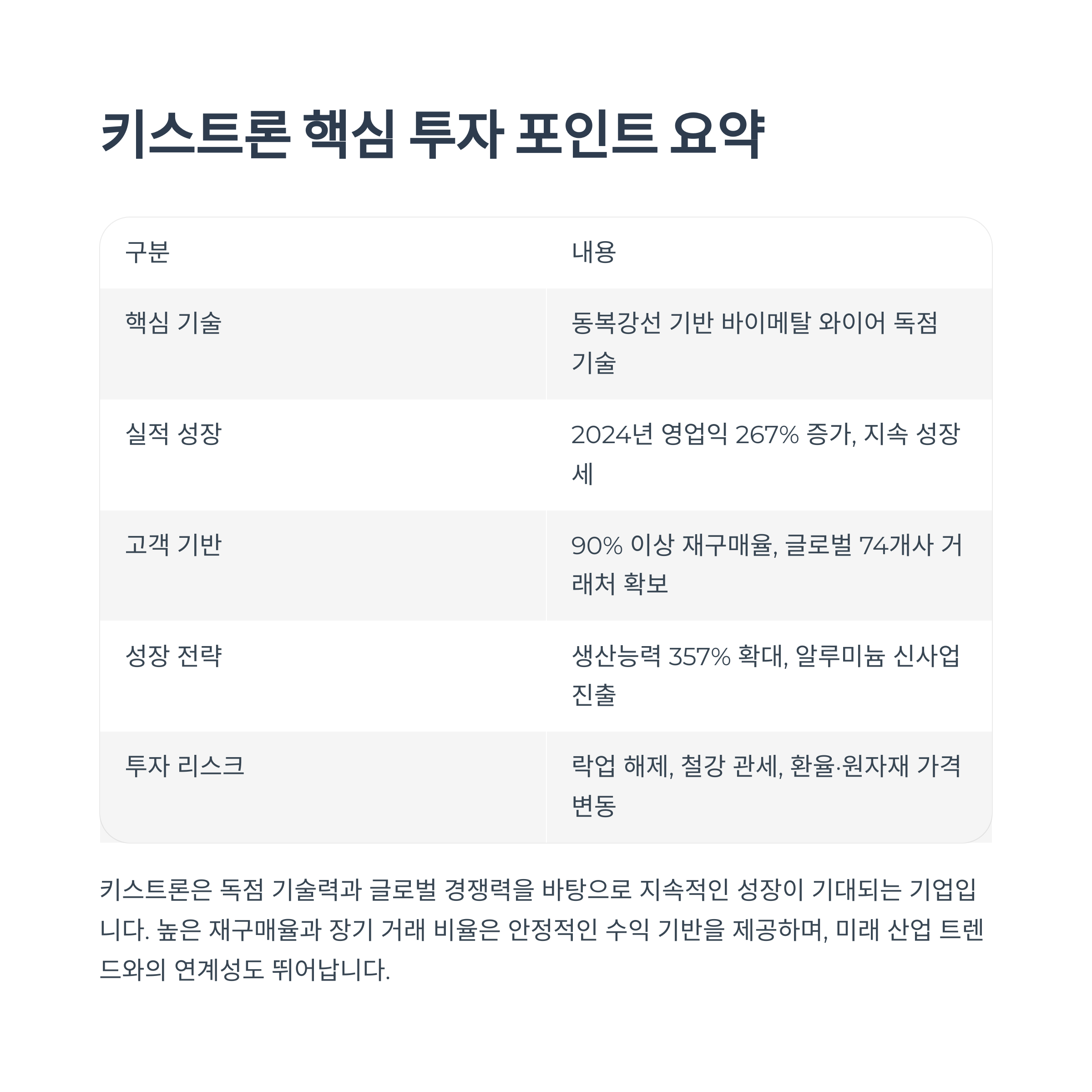 2025년 6월 상장과 동시에 시장의 주목을 받은 키스트론은 바이메탈 와이어 시장에서 독보적인 기술력과 글로벌 수출 경쟁력을 가진 기업입니다. 본 글에서는 상장 이후 주가 흐름, 수급 구조, 핵심 기술력, 실적 전망, 리스크 요인 등을 종합적으로 분석하여 장기적 투자 전략에 필요한 통찰을 제공합니다.