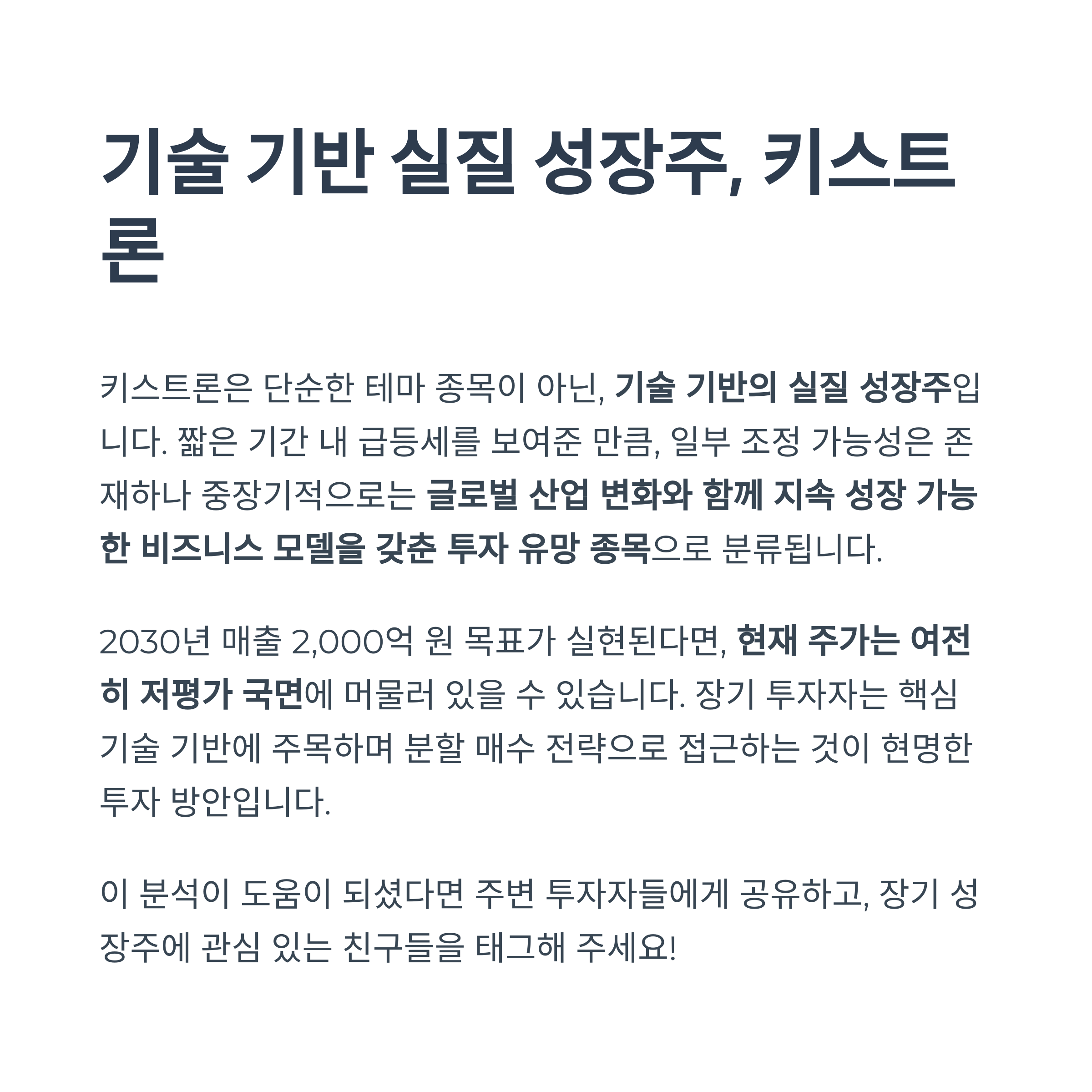 키스트론은 단순한 테마 종목이 아닌 기술 기반의 실질 성장주입니다. 장기적으로는 생산능력 확충과 기술 진화에 따라 주가 상승 여력은 충분하므로, 중장기 투자자라면 분할 매수를 통한 접근이 바람직합니다.