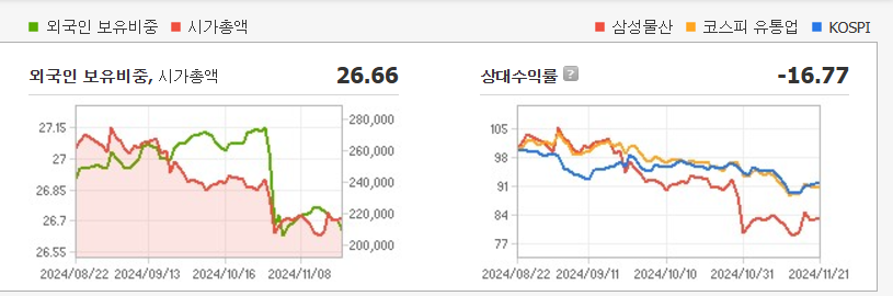 단기 포트폴리오를 구성한다면 시가 총액과 장중 거래량도 꼭 살펴봐야 합니다. 삼성물산의 시가 총액은 21조8674억 원이며 장중 거래량은 231,254원 을 기록했습니다. 대주주의 정보는 중요하지 않을 수 있지만 장기적으로는 확인해보는 것이 좋겠습니다.