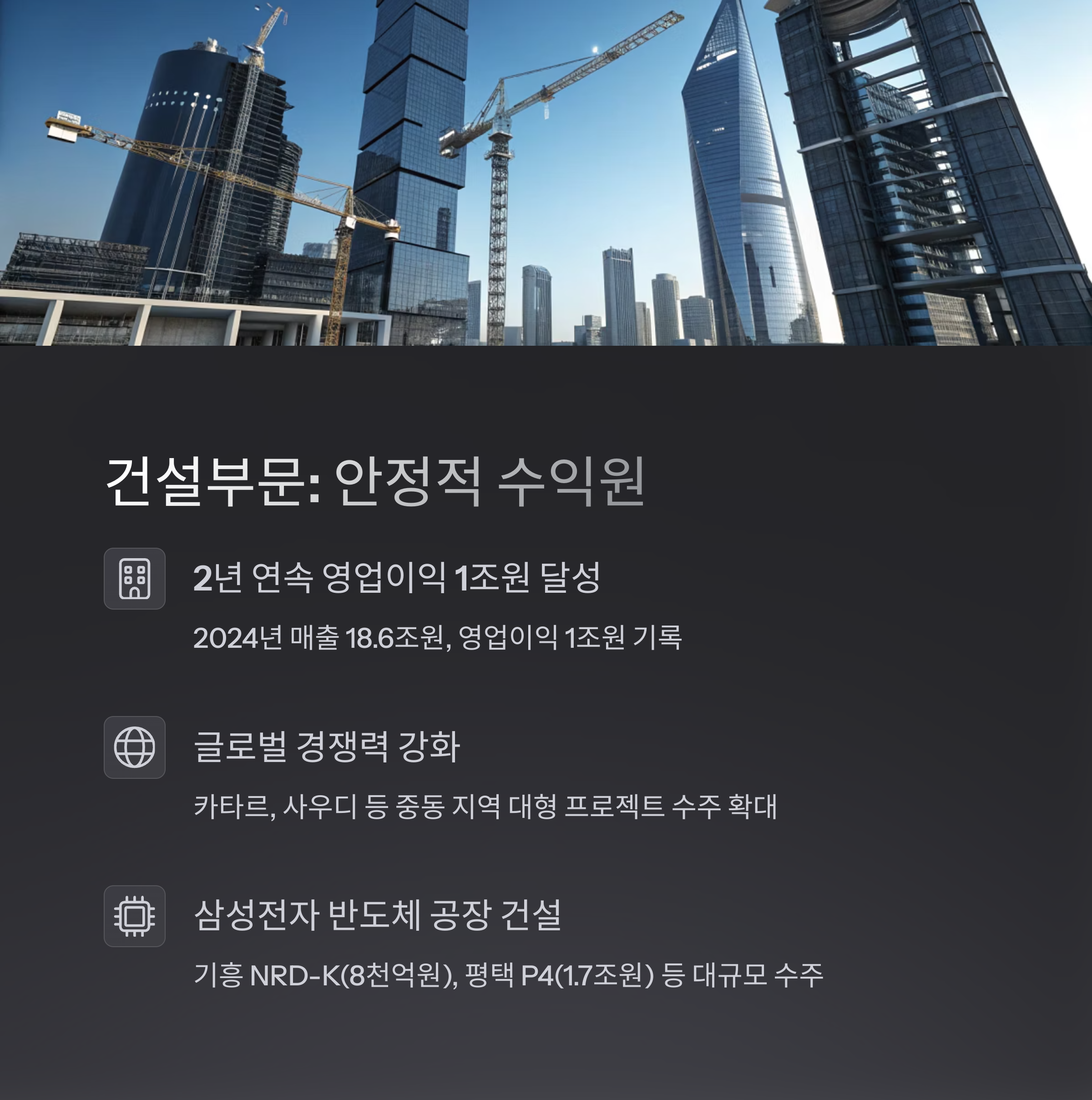 건설과 바이오 부문의 균형잡힌 성장세,