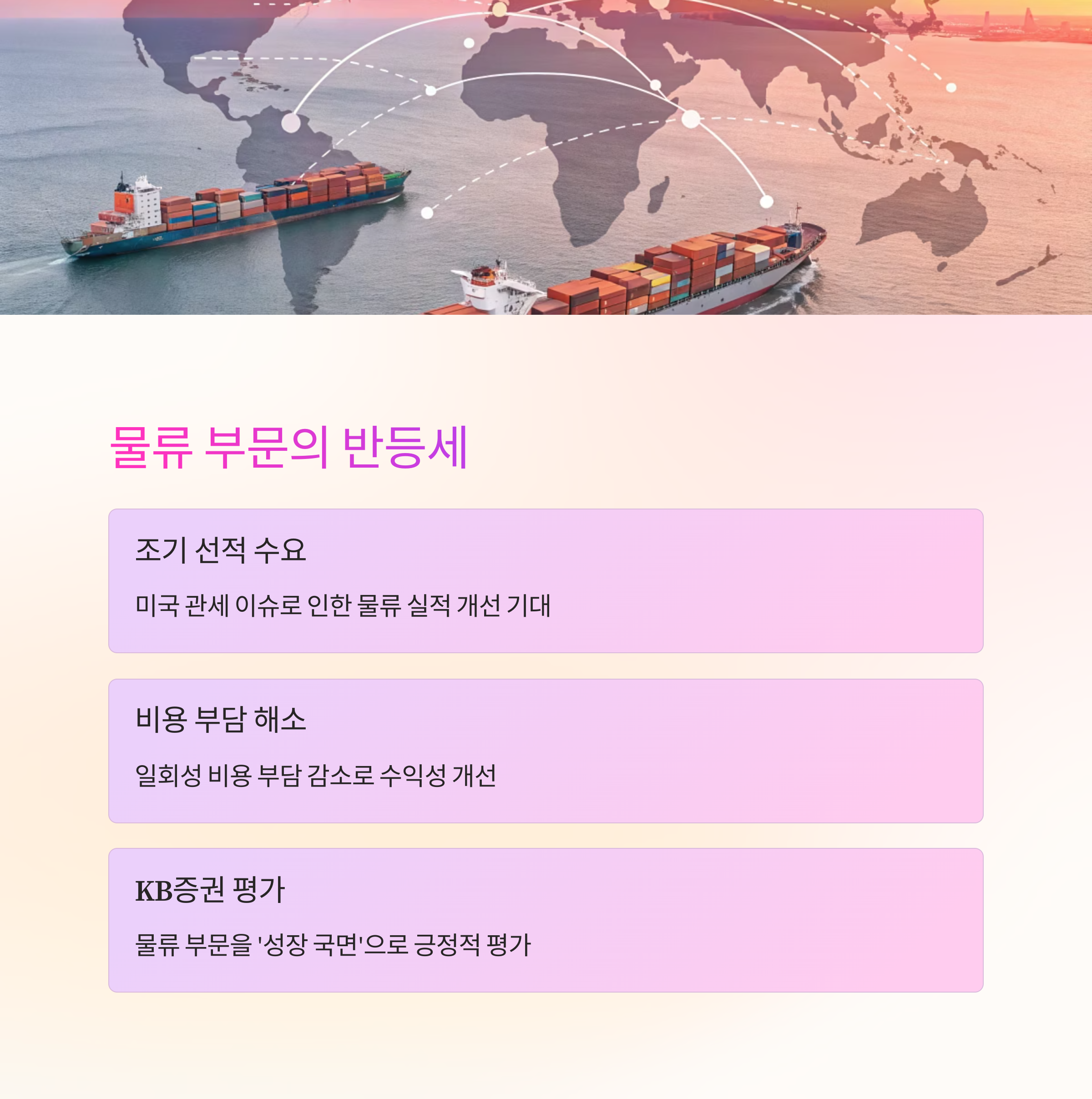 미국 관세 이슈로 조기 선적 수요가 발생하면서 물류 실적 개선이 기대됩니다.
