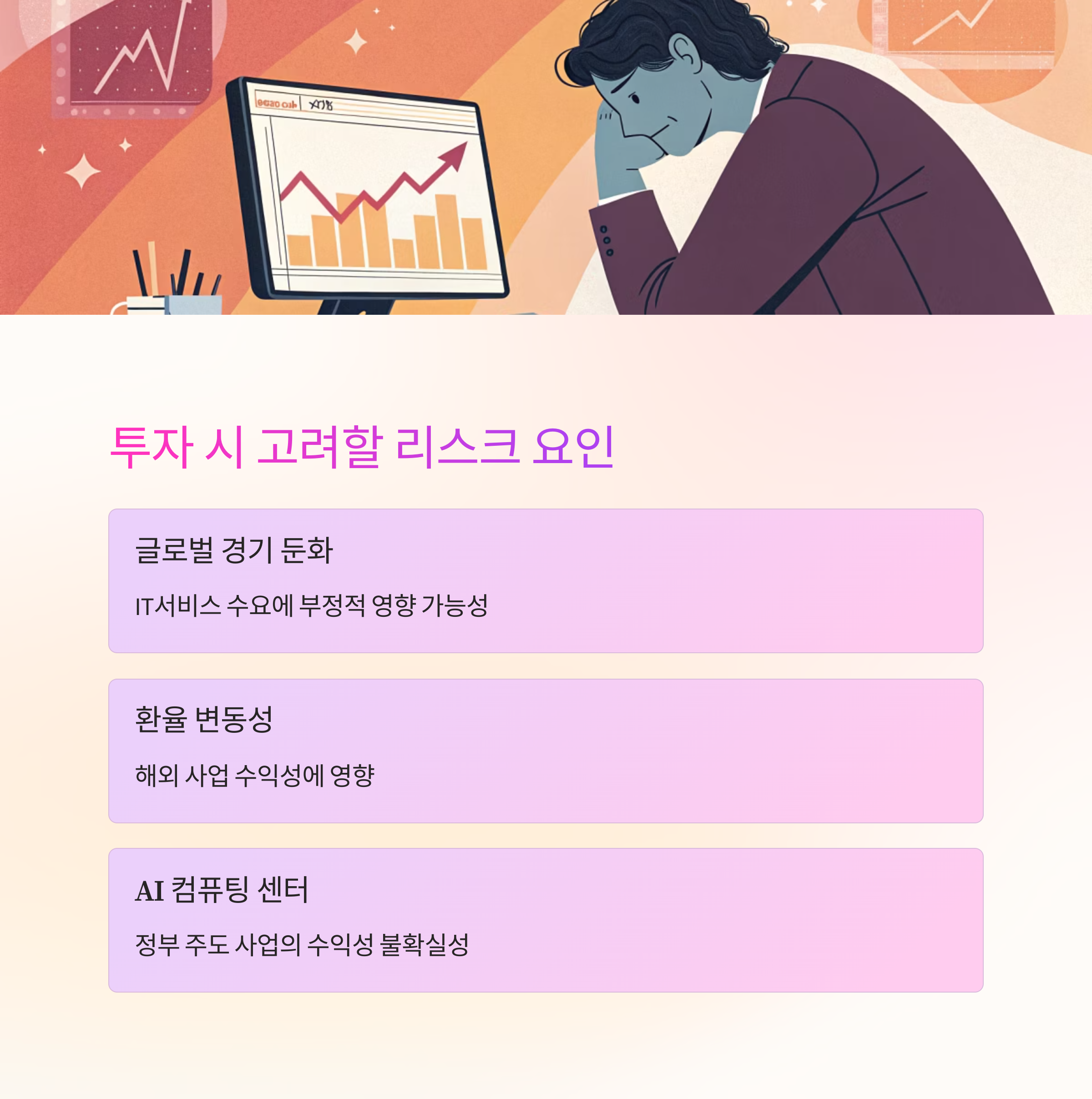 글로벌 경기 둔화와 환율 변동성은 IT서비스 수요에 영향을 줄 수 있으며,