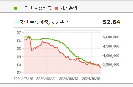 단기 포트폴리오를 구성할 때는 시가 총액과 장중 거래량을 살펴봐야 합니다. 삼성전자의 시가 총액은 333조7108억 원이며 장중 거래량은 25,829,315원 을 기록했습니다. 대주주의 정보는 중요하지 않을 수도 있지만 장기적인 관점에서는 확인하는 것이 좋습니다.