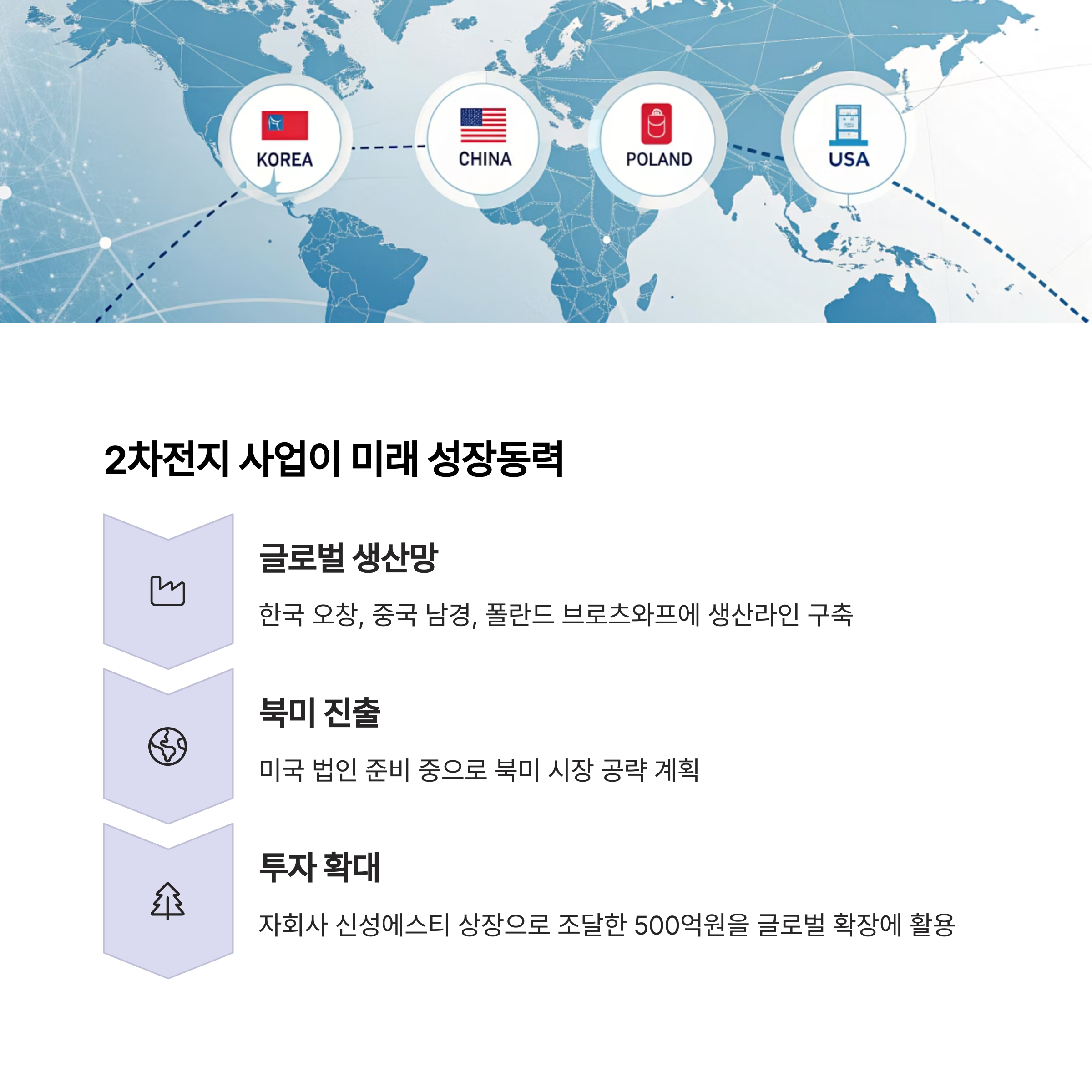 특히 2023년 코스닥에 상장한 자회사 신성에스티를 통해 조달한 자금 약 500억원을 글로벌 확장에 활용하며 2차전지 사업 경쟁력을 높이고 있습니다.