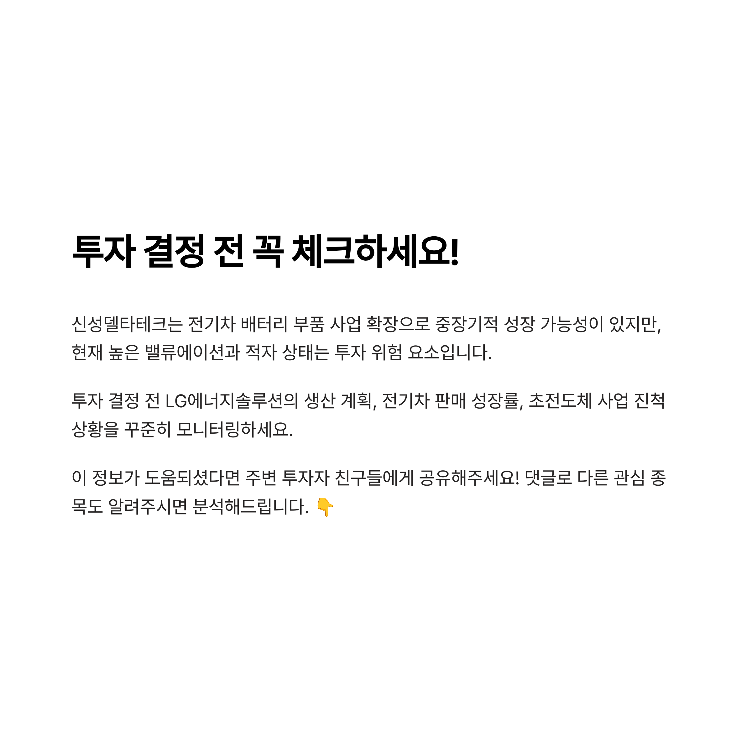 다만 전기차 시장 확대, LG에너지솔루션 증설, 북미 공장 가동 등이 본격화되면 중장기적으로 재평가 받을 가능성도 큽니다.
