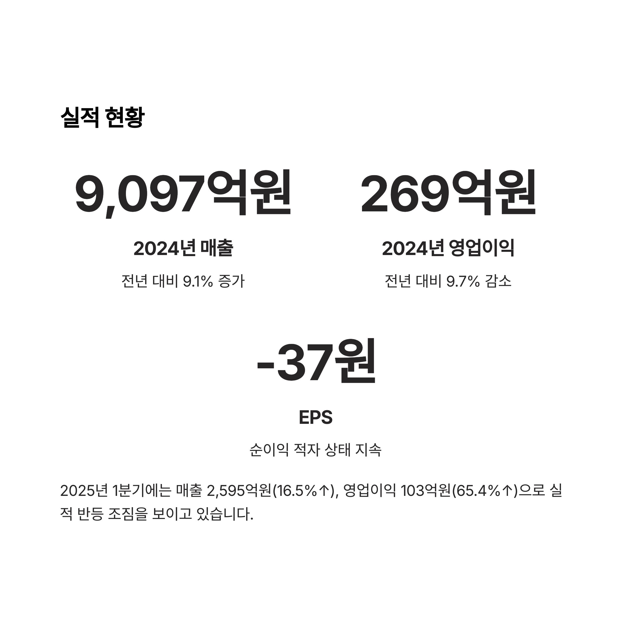 2025년 1분기에는 매출 2,595억원, 영업이익 103억원으로 각각 16.5%, 65.4% 증가해 실적이 반등하는 모습을 보였습니다.