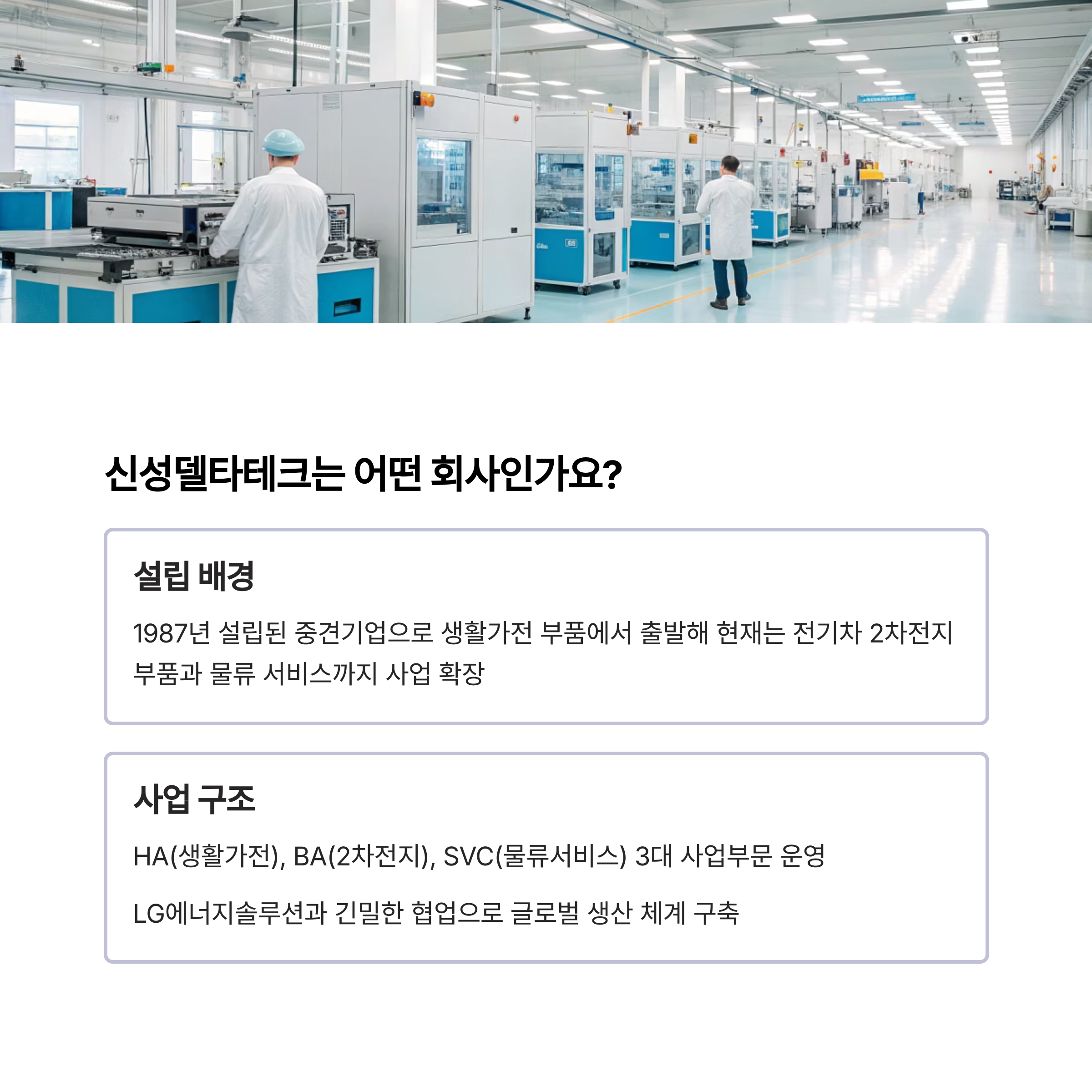 신성델타테크는 1987년 설립되어 생활가전 부품에서 출발한 기업으로, 현재는 전기차 2차전지 부품과 물류 서비스까지 사업을 확장한 중견기업입니다. LG에너지솔루션과의 긴밀한 협업을 통해 글로벌 생산 체계를 구축하며 성장 동력을 확보했지만, 최근 적자 상태와 높은 밸류에이션으로 인해 투자자들의 고민도 깊어지고 있습니다. 오늘은 신성델타테크의 사업 구조와 실적, 그리고 주가 전망까지 꼼꼼히 살펴보겠습니다.