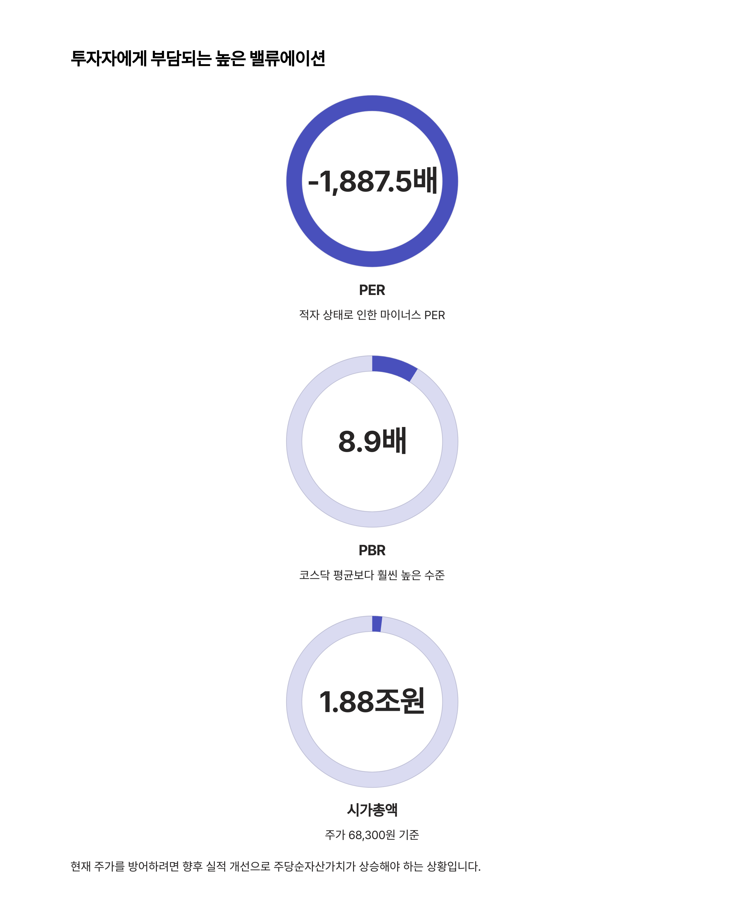 하지만 PER이 -1,887.5배로 적자를 나타내고 있고, PBR은 8.9배로 코스닥 평균보다 훨씬 높은 수준이라 투자자에게는 부담 요인이 됩니다.