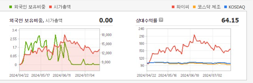 단기 포트폴리오를 구성할 때는 시가 총액과 장중 거래량도 체크해야 합니다. 와이씨의 시가 총액은 1조3226억 원이며 장중 거래량은 5,580,941원 을 기록했습니다. 대주주의 정보는 크게 중요하지 않지만 장기적인 관점에서는 확인이 필요합니다.