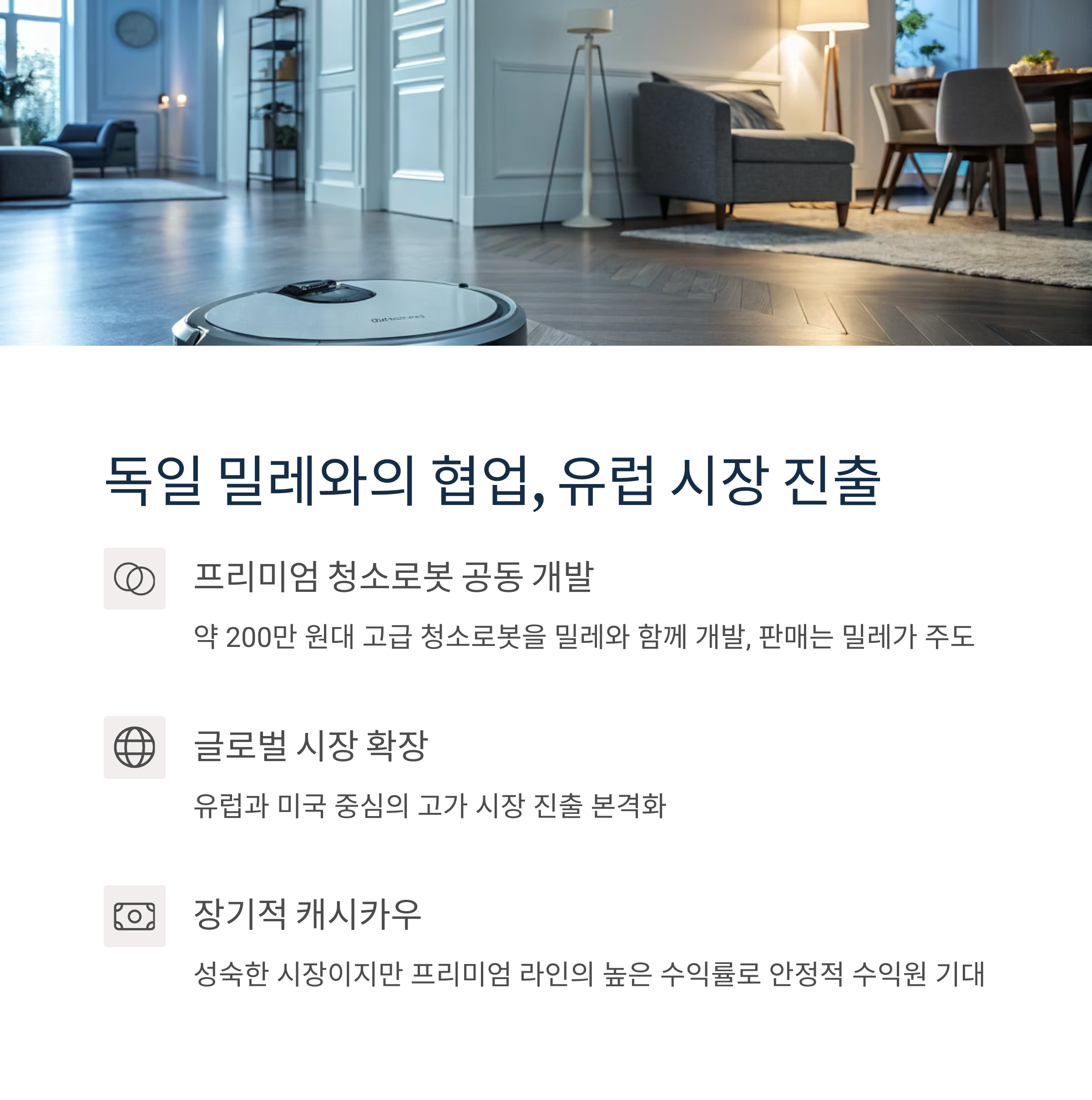 2023년 12월, 국내 청소로봇 사업을 종료하고 밀레와 협업한 프리미엄 로봇 개발에 집중하면서 사업 구조가 빠르게 변하고 있습니다.