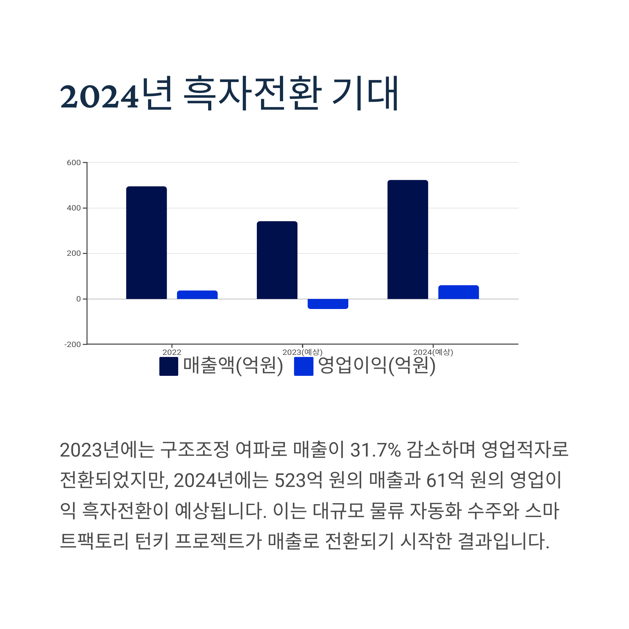 2024년에는 523억 원의 매출과 61억 원의 영업이익 흑자전환이 예상됩니다.
