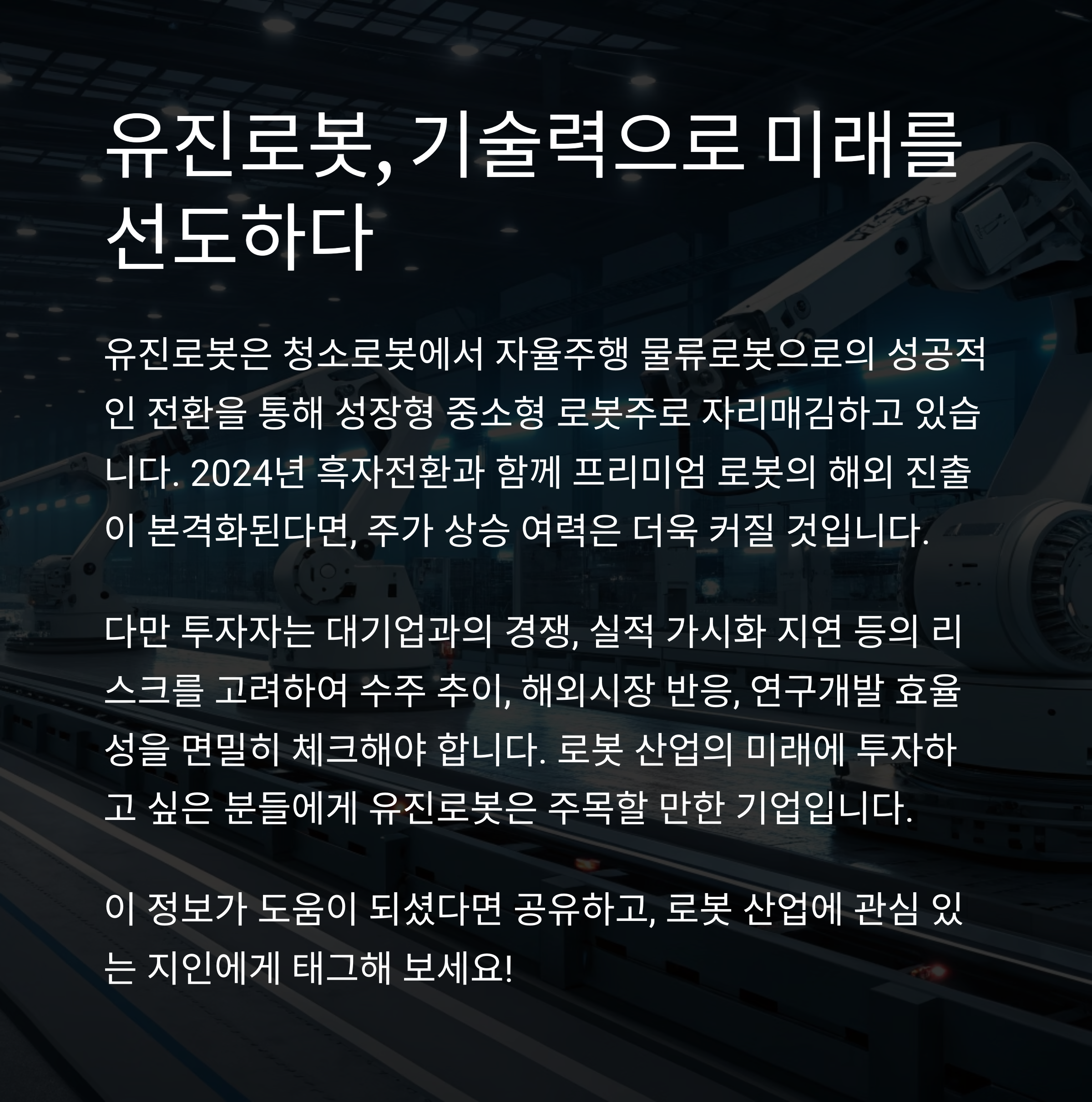 유진로봇은 기술 중심의 체질 전환과 글로벌 확장을 바탕으로 성장형 중소형 로봇주로 자리매김하고 있습니다.