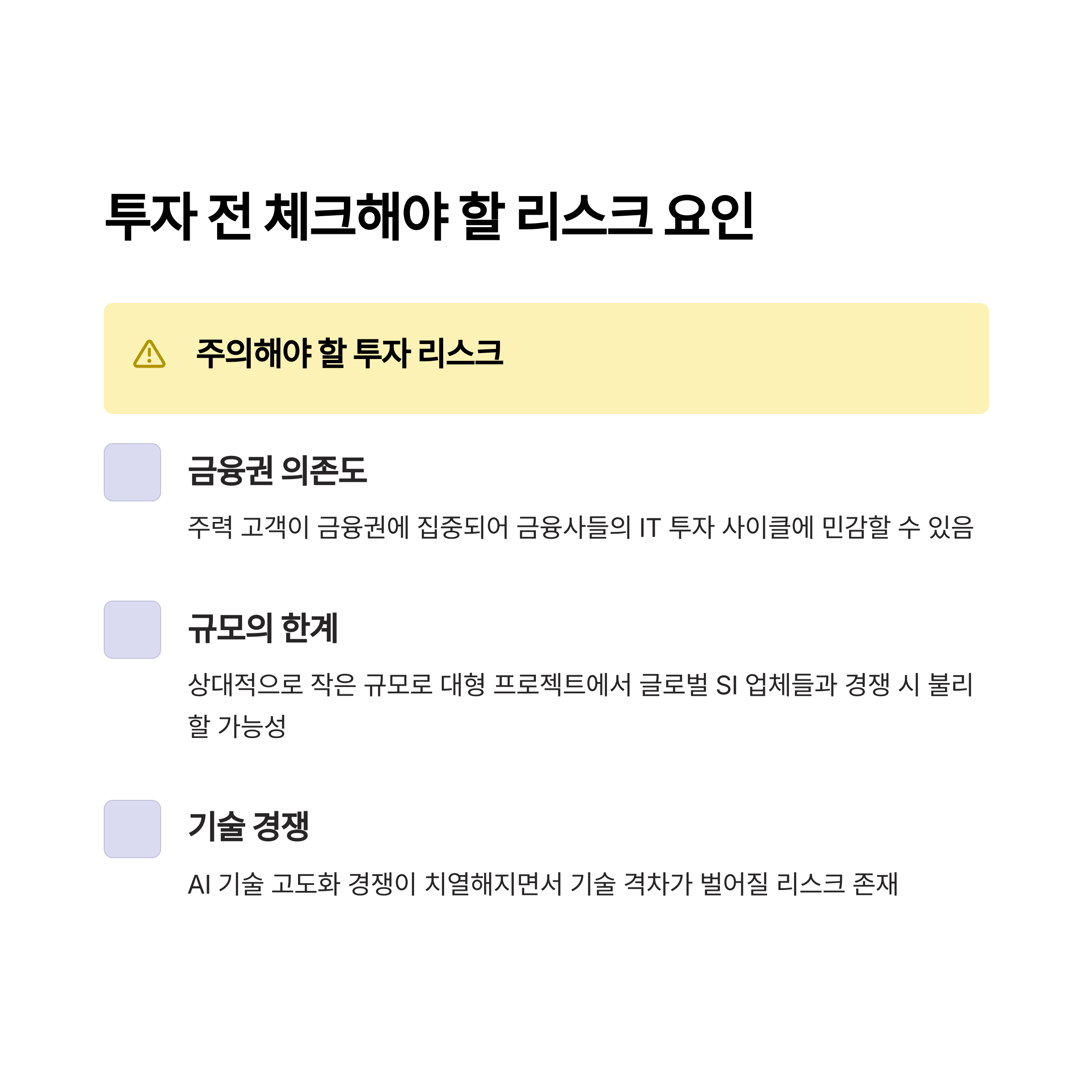 또한 상대적으로 규모가 작아 대형 프로젝트에서 글로벌 SI(시스템통합) 업체들과 경쟁 시 불리할 가능성도 있습니다.