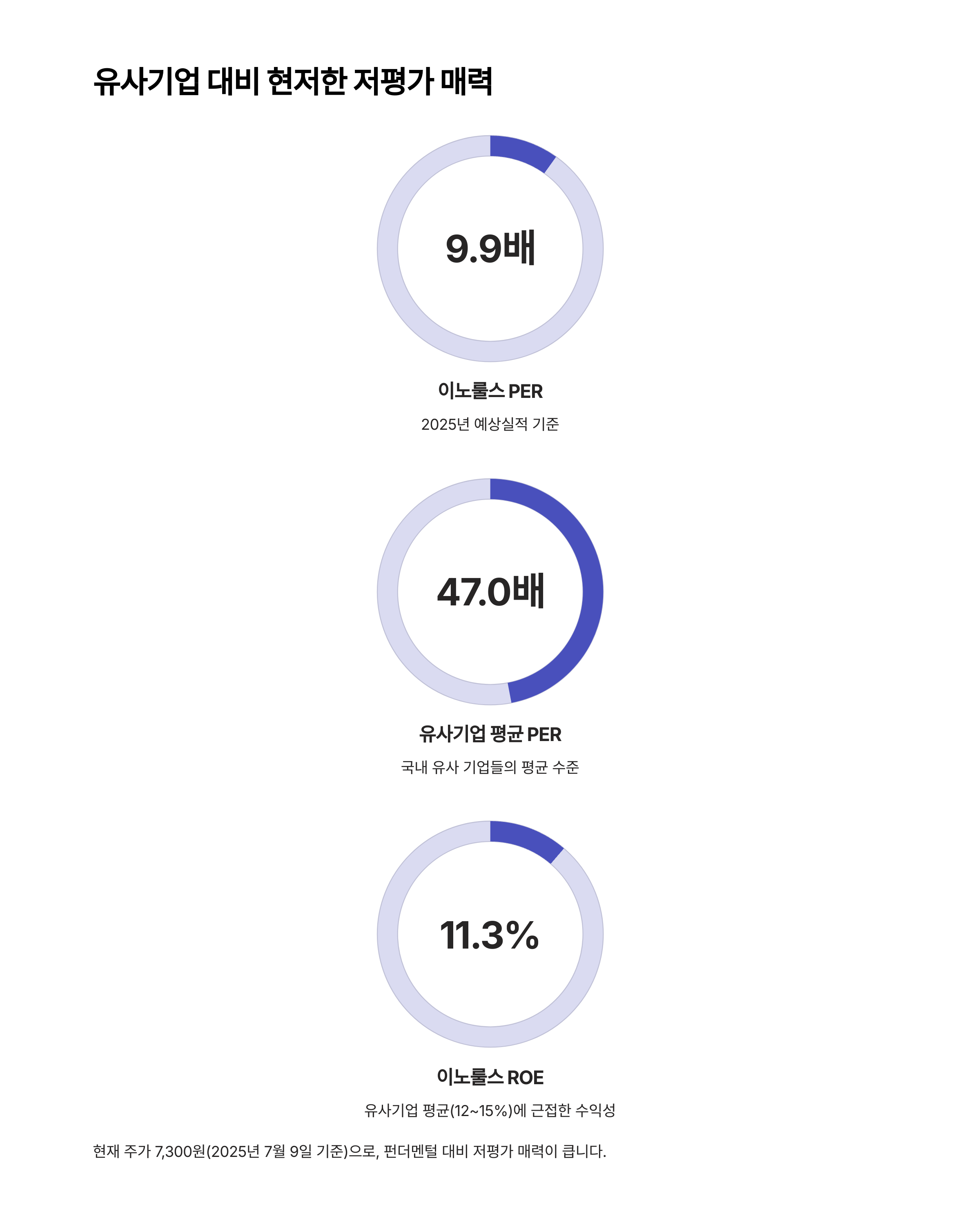 현재 주가는 7,300원(2025년 7월 9일 기준)으로, 2025년 예상실적 기준 PER이 9.9배 수준입니다.