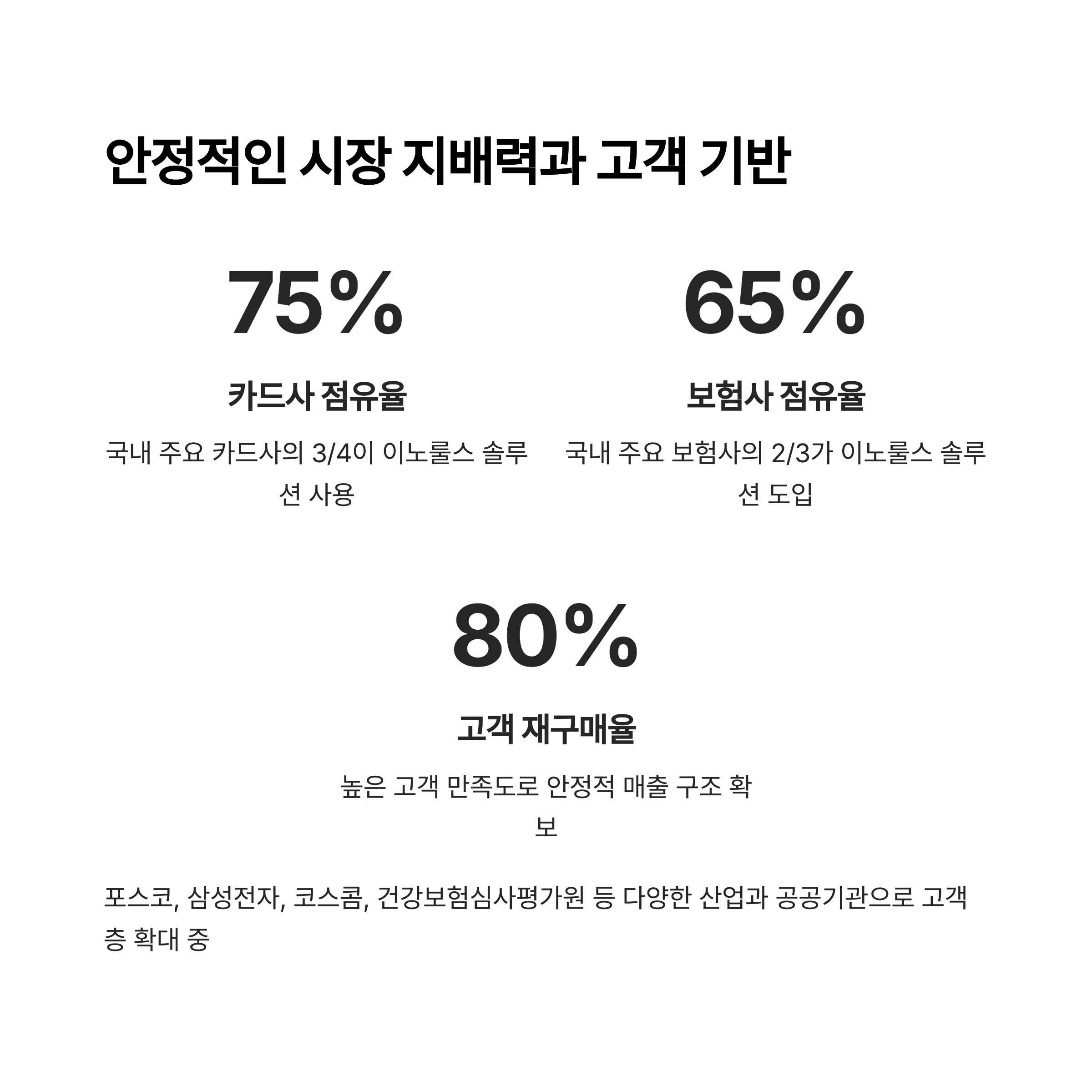 포스코, 삼성전자, 코스콤, 건강보험심사평가원 등 다양한 산업과 공공기관에도 제품을 공급하며 고객 재구매율이 80%에 달해 안정적 매출 구조를 확보하고 있습니다.