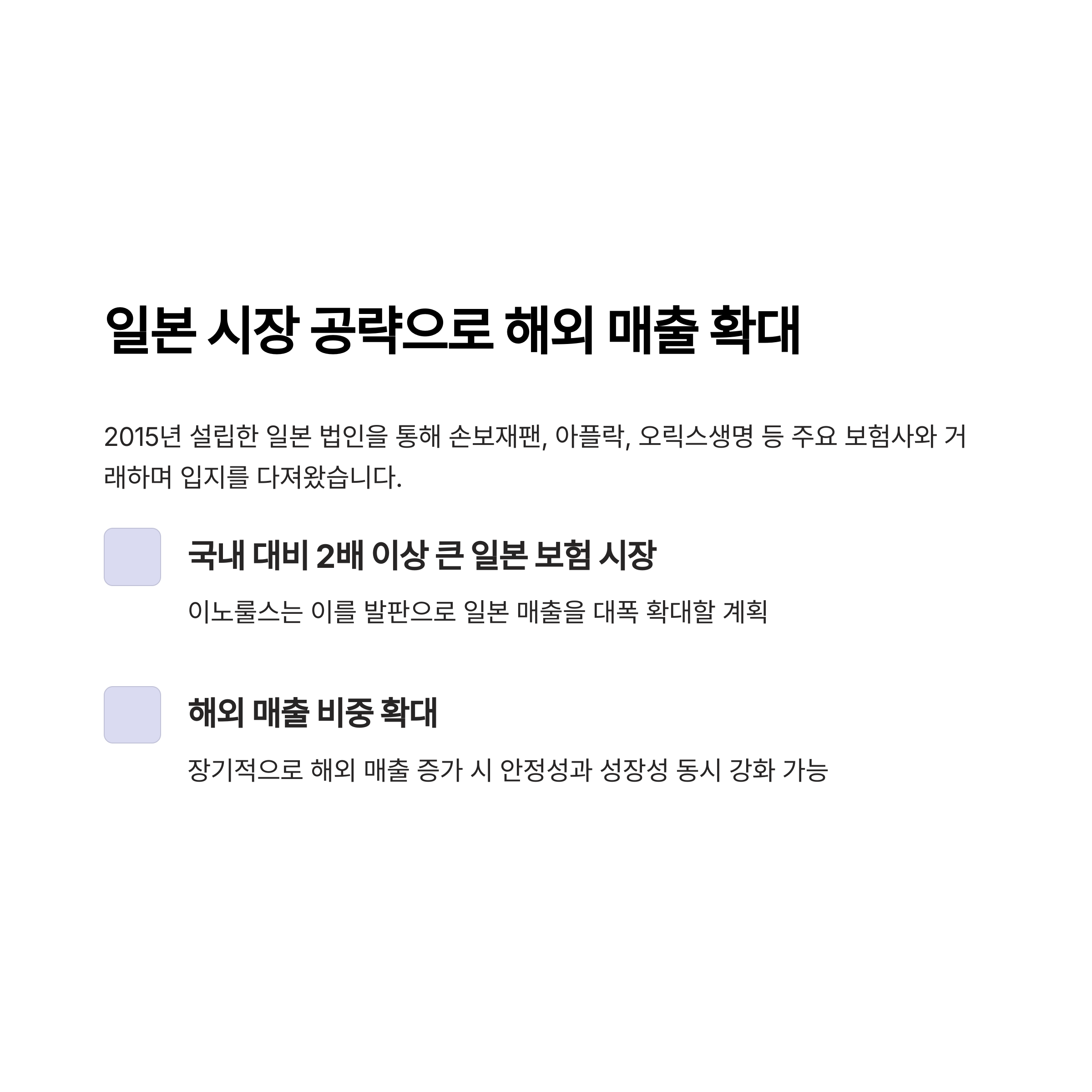 2015년 설립한 일본 법인을 통해 손보재팬, 아플락, 오릭스생명 등 주요 보험사와 거래하며 입지를 다져왔습니다.