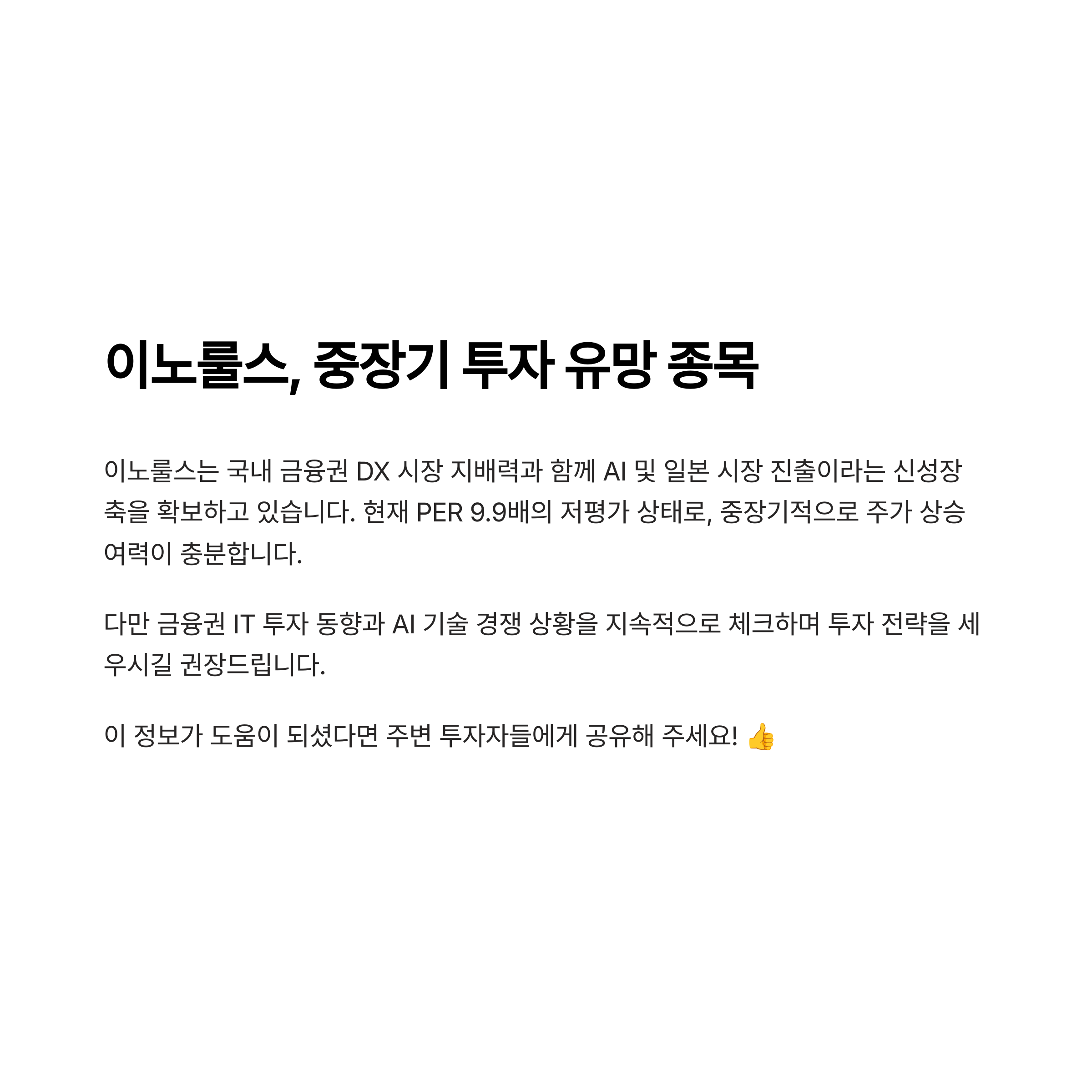 다만 금융권 IT 투자 동향과 AI 기술 경쟁 상황을 지속적으로 체크하며 투자 전략을 세우시길 권장드립니다.''