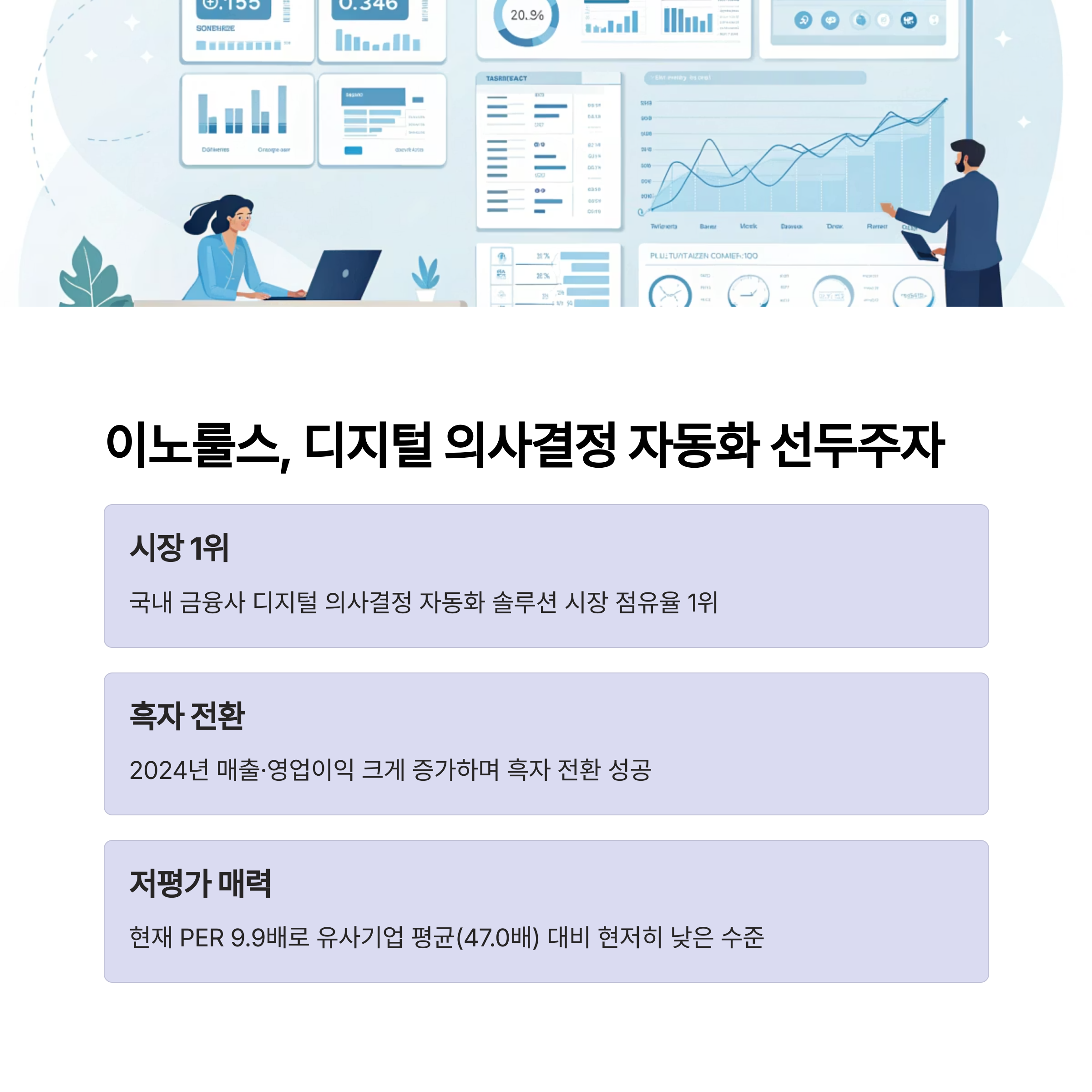 이노룰스는 국내 금융사들의 디지털 의사결정을 자동화하는 솔루션을 공급하며 시장 점유율 1위를 차지하고 있습니다. 최근에는 AI 전담조직 신설과 일본 시장 확대 등으로 사업영역을 넓히고 있으며, 2024년에는 매출과 영업이익이 크게 증가해 흑자 전환에 성공했습니다. 2025년에는 AI 기반 신제품 출시와 수주 증가에 힘입어 추가 성장이 기대되며, 주가는 현재 PER 9.9배로 저평가 매력이 부각되고 있습니다. 이번 글에서 이노룰스의 경쟁력과 투자 포인트를 구체적으로 살펴보세요.