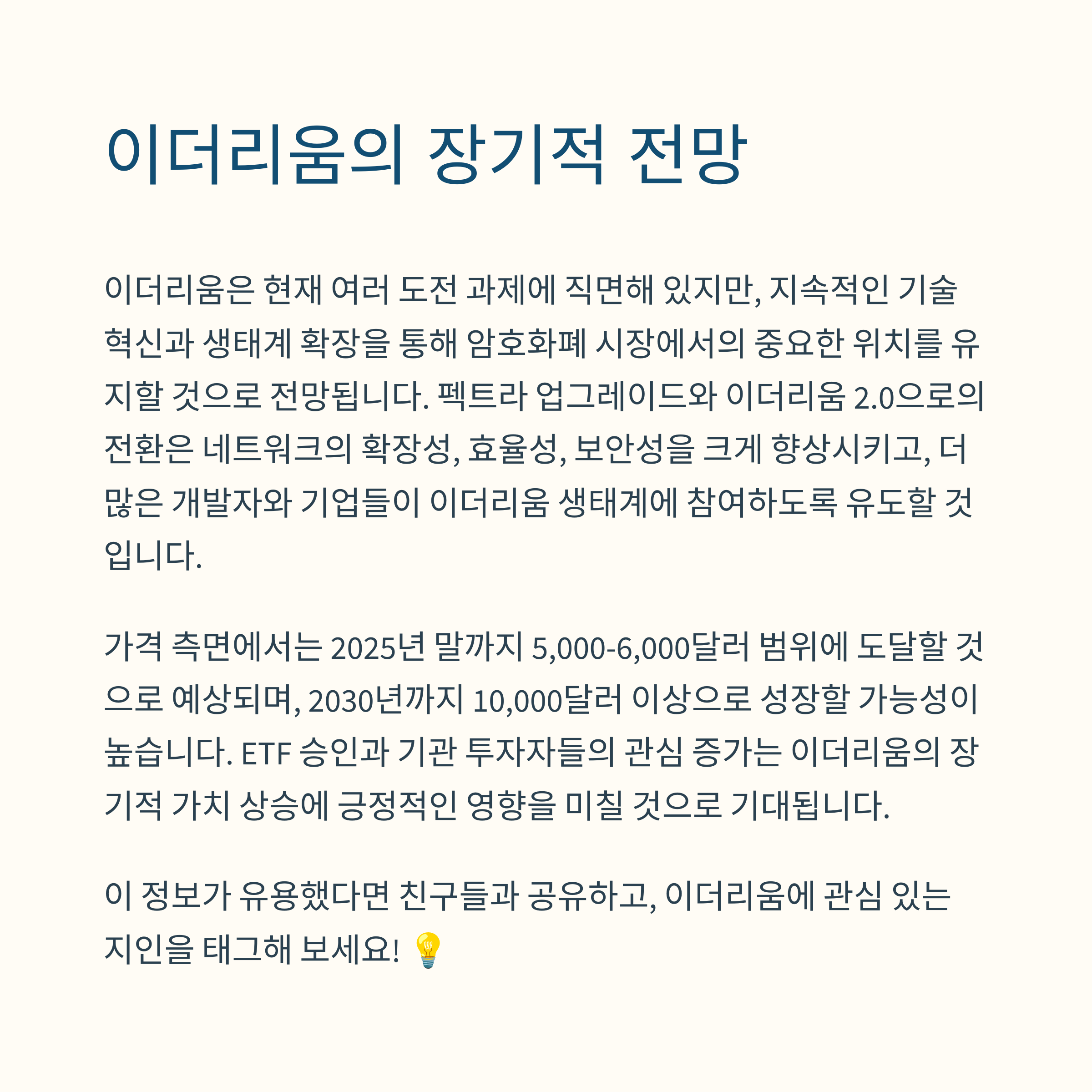 이 말처럼, 이더리움의 미래는 단순한 가격 상승이 아닌 기술적 진화와 생태계 전략에 달려 있습니다.