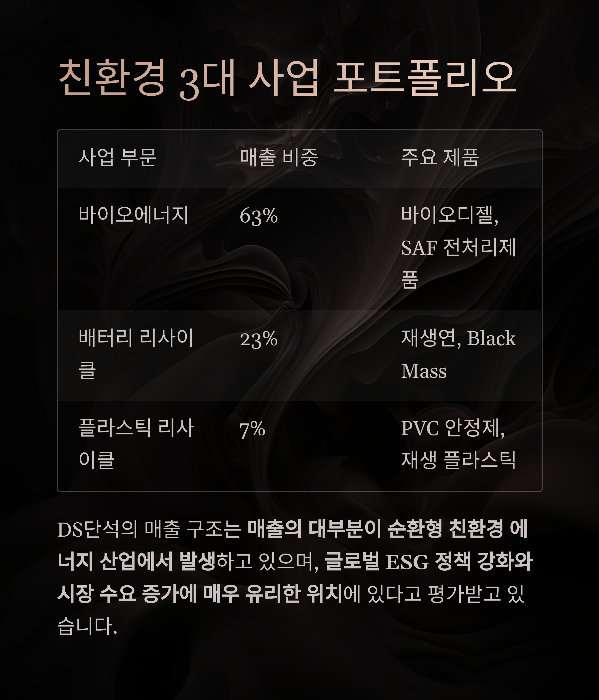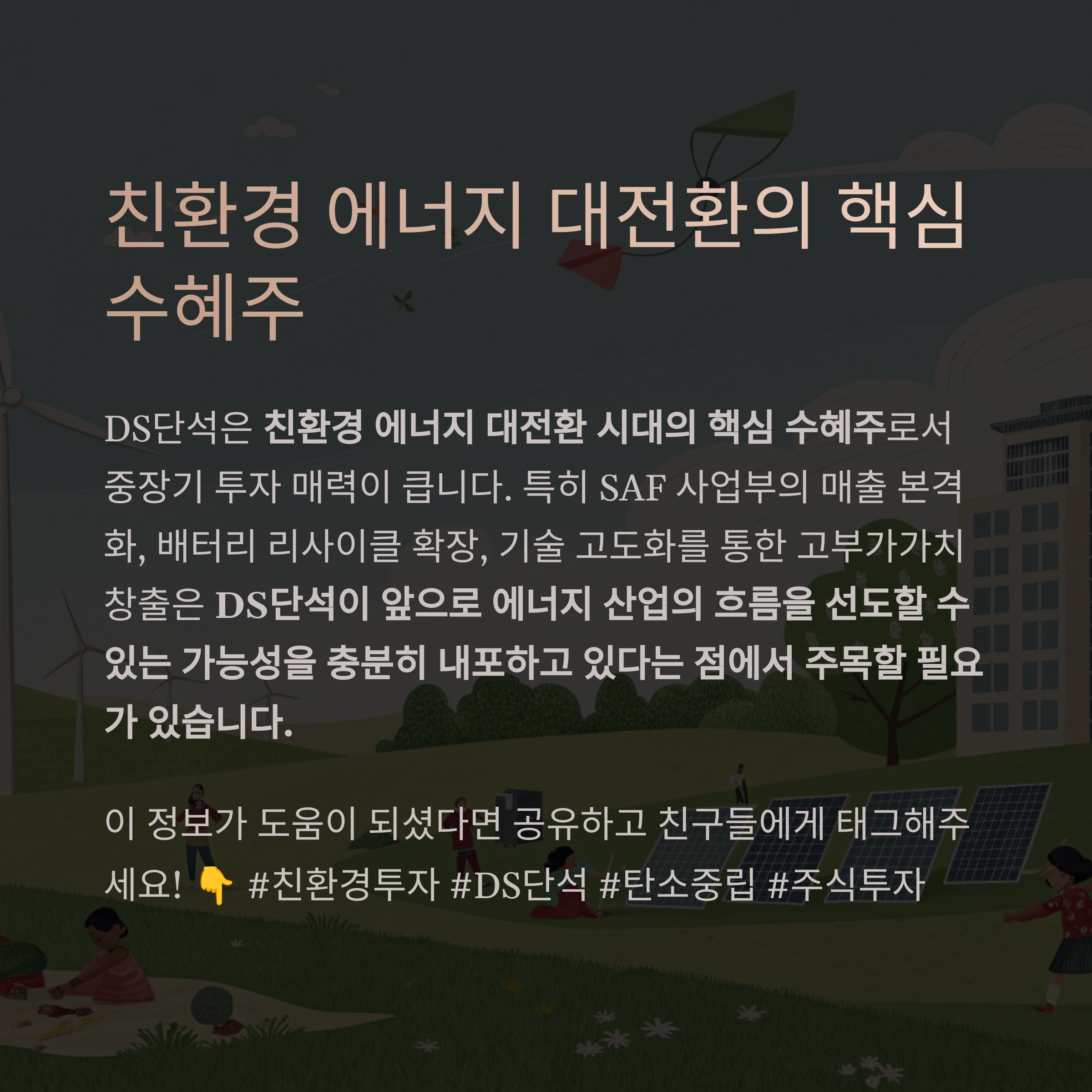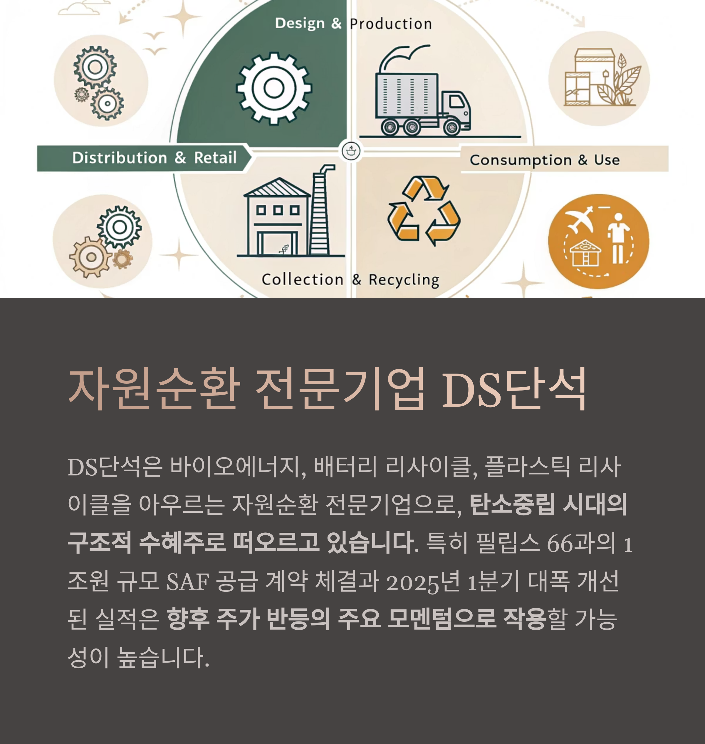 DS단석은 SAF·배터리 리사이클·플라스틱 리사이클이라는 3대 친환경 축을 기반으로 중장기 성장 가능성이 높고, 필립스66 계약을 통해 매출 안정성도 확보한 핵심 수혜주입니다.