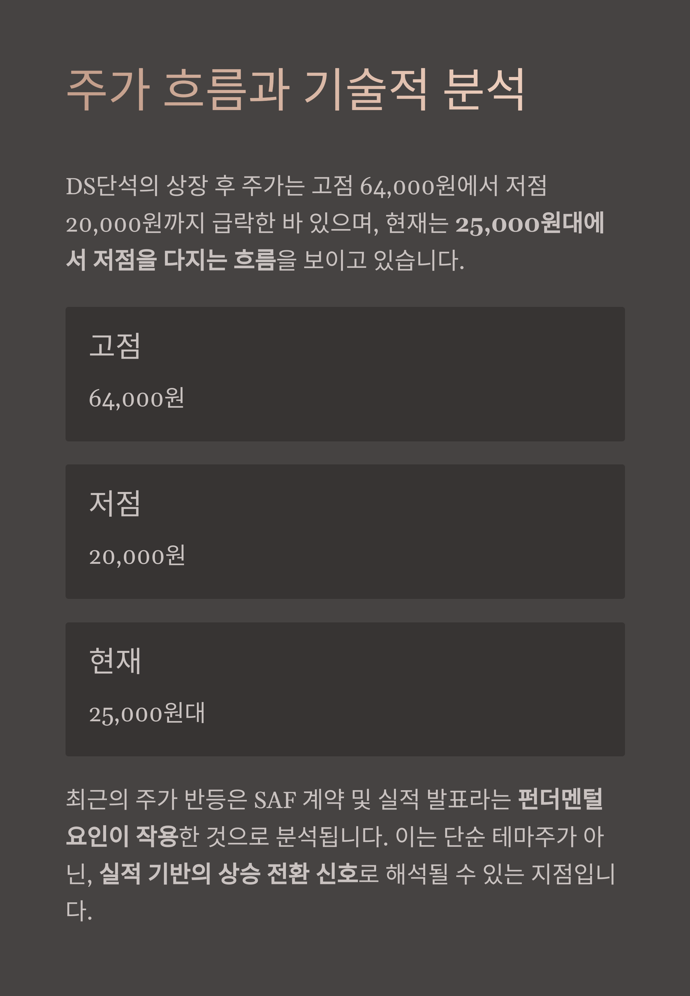 현재 DS단석의 주가는 25,000원대에서 저점을 다지는 흐름을 보이며, 최근의 상승세는 펀더멘털 개선에 기반한 것으로 평가됩니다.