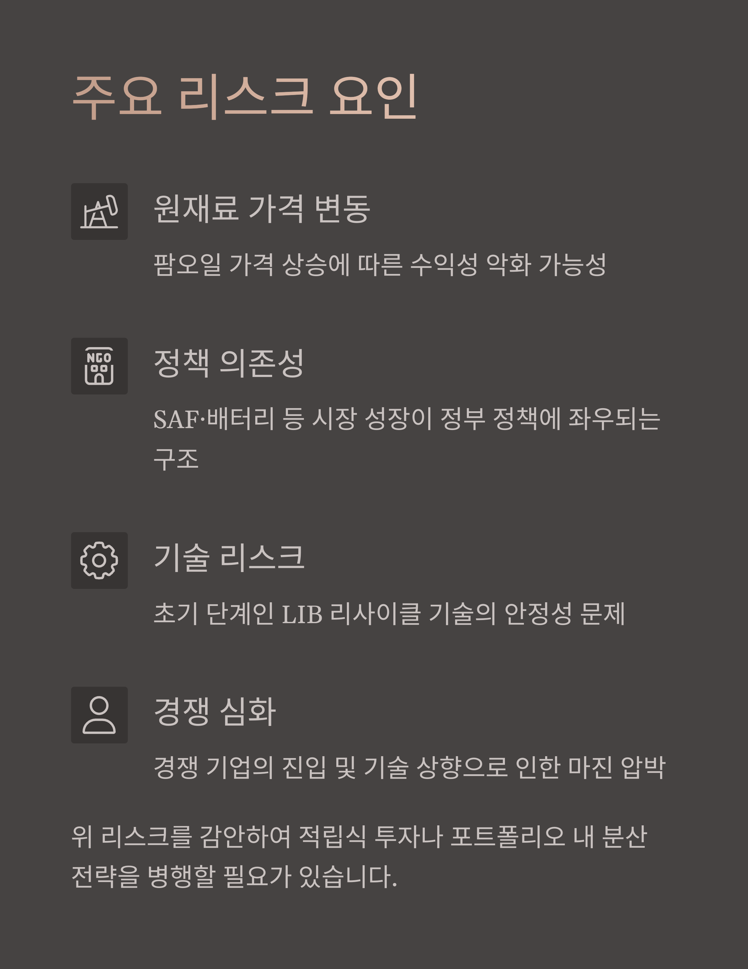팜오일 가격 상승, 폐배터리 수급 불안정, 정부 정책 변화 등은 투자 시 주의할 주요 리스크입니다.