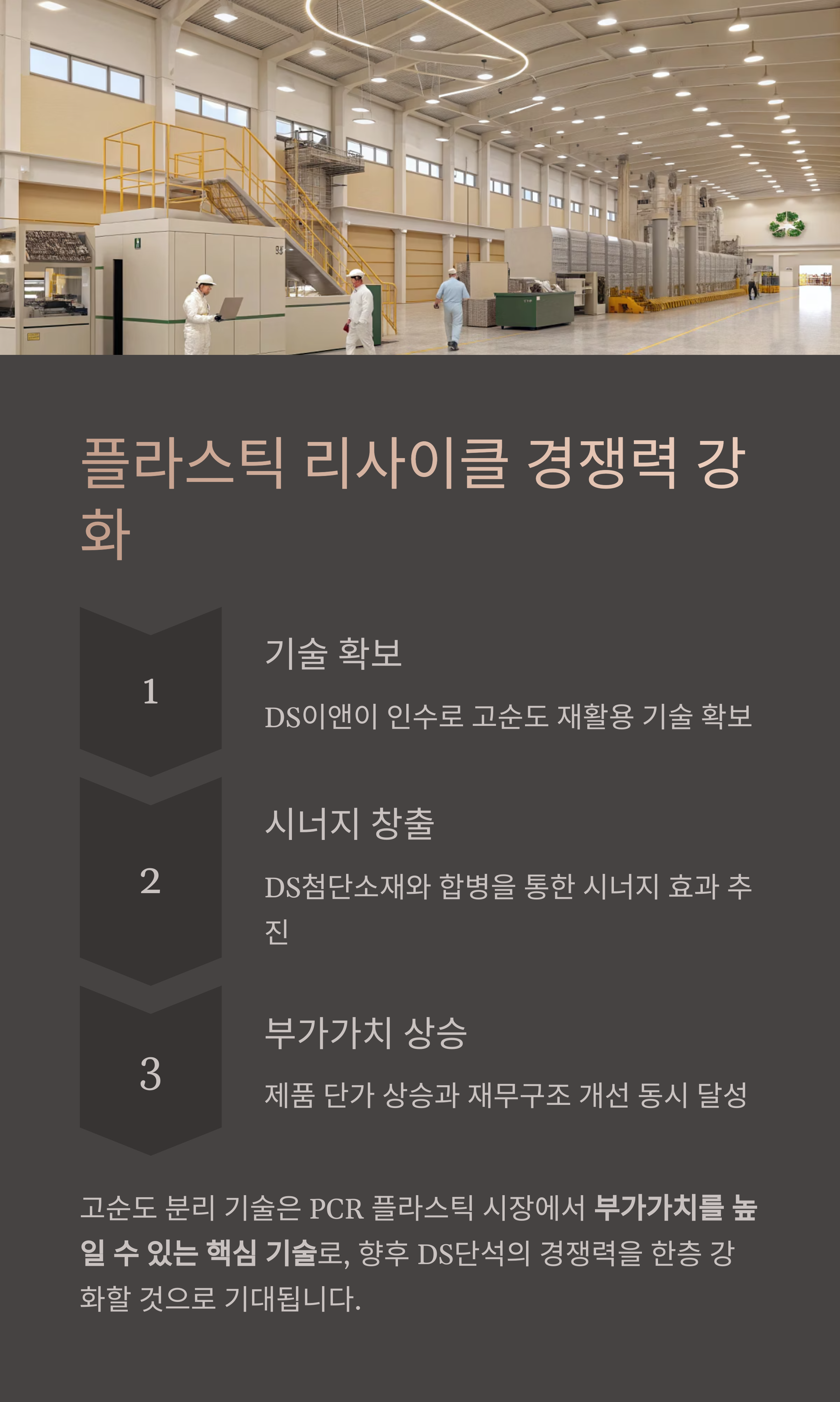 2023년 DS이앤이 인수와 2024년 DS첨단소재 합병을 통해 고순도 분리 기술 확보 및 플라스틱 재활용 고도화가 추진 중입니다.