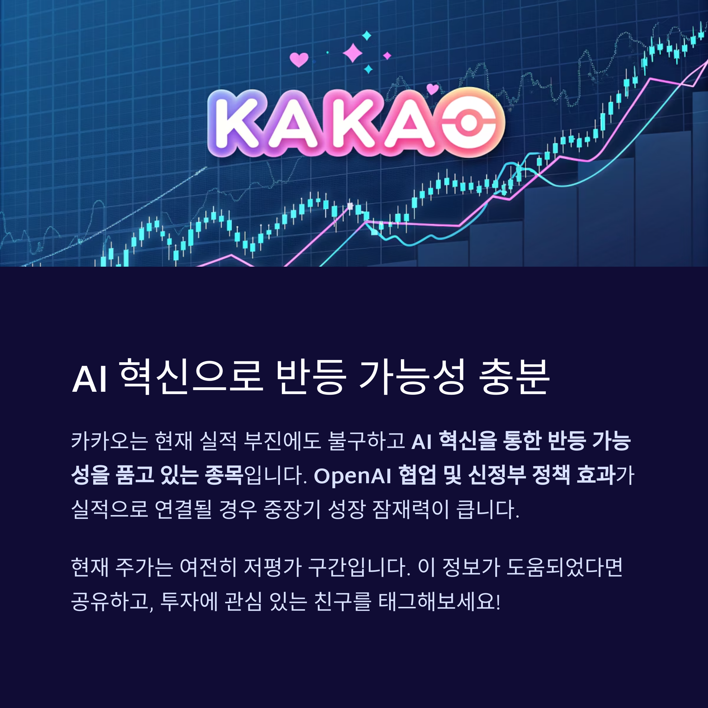 카카오는 현재 실적 부진에도 불구하고 AI 혁신을 통한 반등 가능성을 품고 있는 종목입니다.