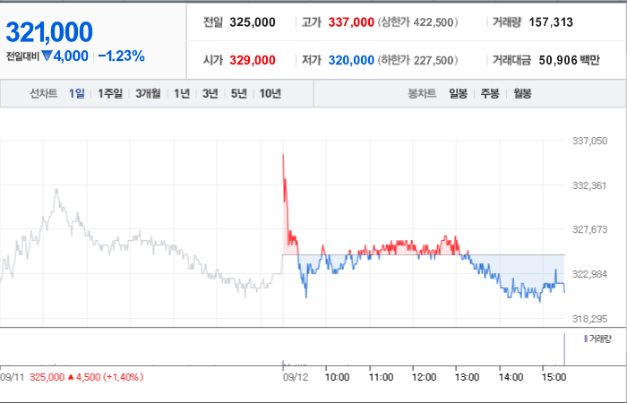 현재 크래프톤의 주가는 325,000원으로, 전일 대비 변동이 있음을 나타내고 있습니다. 주주 현황을 보면 장병규 씨와 30명의 기타 주주가 총 35.15%의 지분을 보유하고 있습니다. 크래프톤은 게임 소프트웨어 회사로, 현재 장중 기준 주가는 325,000원입니다. 회사의 시가 총액은 15조 3,740억 원이며, 발행된 주식 수는 47,894,022주입니다. 외국인 투자자의 보유 비율은 40.95%이며, 장중 거래량은 78,107주에 달했습니다. 또한, 크래프톤의 매출액은 13,729억 원에 이릅니다.