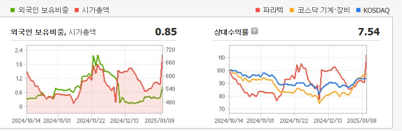 단기 포트폴리오를 구성할 경우 시가 총액과 장중 거래량도 확인해야 합니다. 파라텍의 시가 총액은 663억 원이며 장중 거래량은 15,434,677원 을 기록했습니다. 대주주의 정보는 크게 중요하지 않을 수 있지만 장기적인 관점에서는 확인해보는 것이 좋겠습니다.