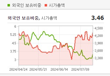 단기 포트폴리오를 구성할 시에는 시가 총액과 장중 거래량도 살펴봐야 합니다. 한국비엔씨의 시가 총액은 4632억 원이며 장중 거래량은 7,550,738원 을 기록했습니다. 대주주의 정보는 중요하지 않을 수도 있으나 장기적으로는 확인이 필요합니다.